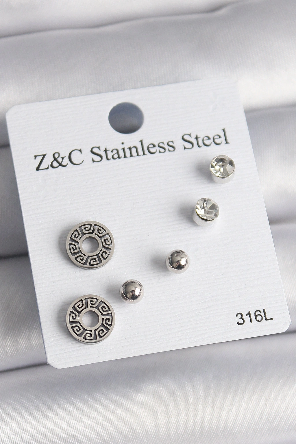 Erb 316L Çelik Gümüş Renk Zirkon Taşlı Labirent Model Kadın Küpe Seti
