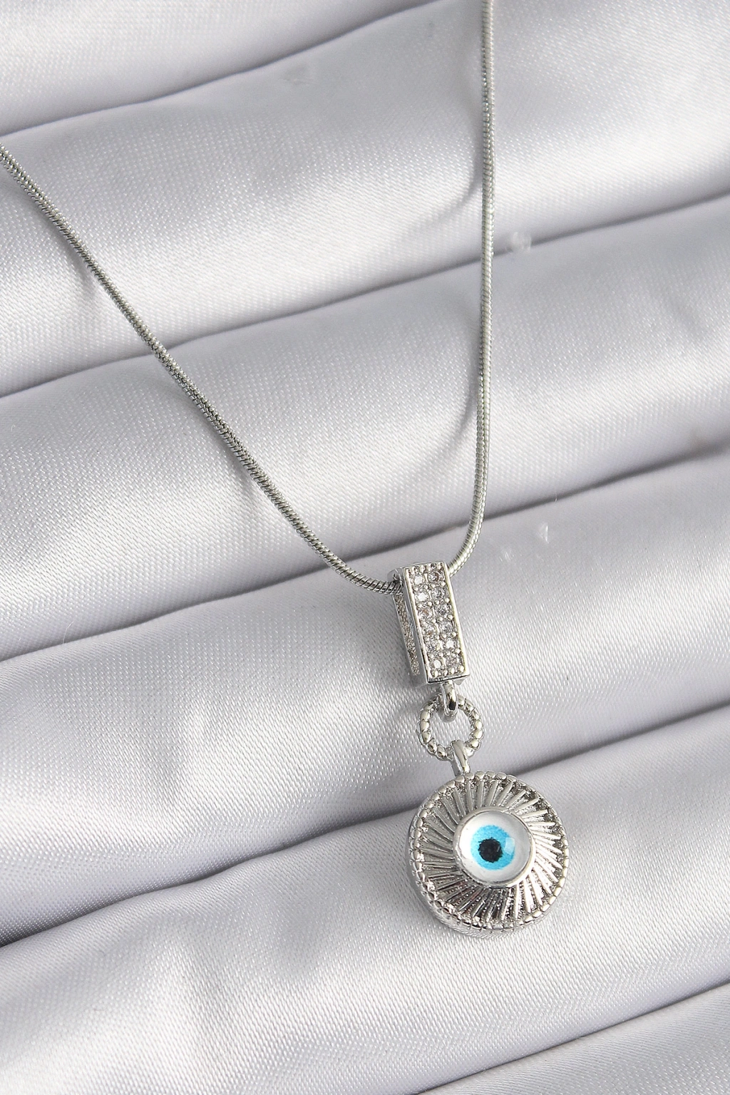 Erb 316L Çelik Gümüş Renk Zirkon Taşlı Nazar Boncuk Model Kadın Kolye