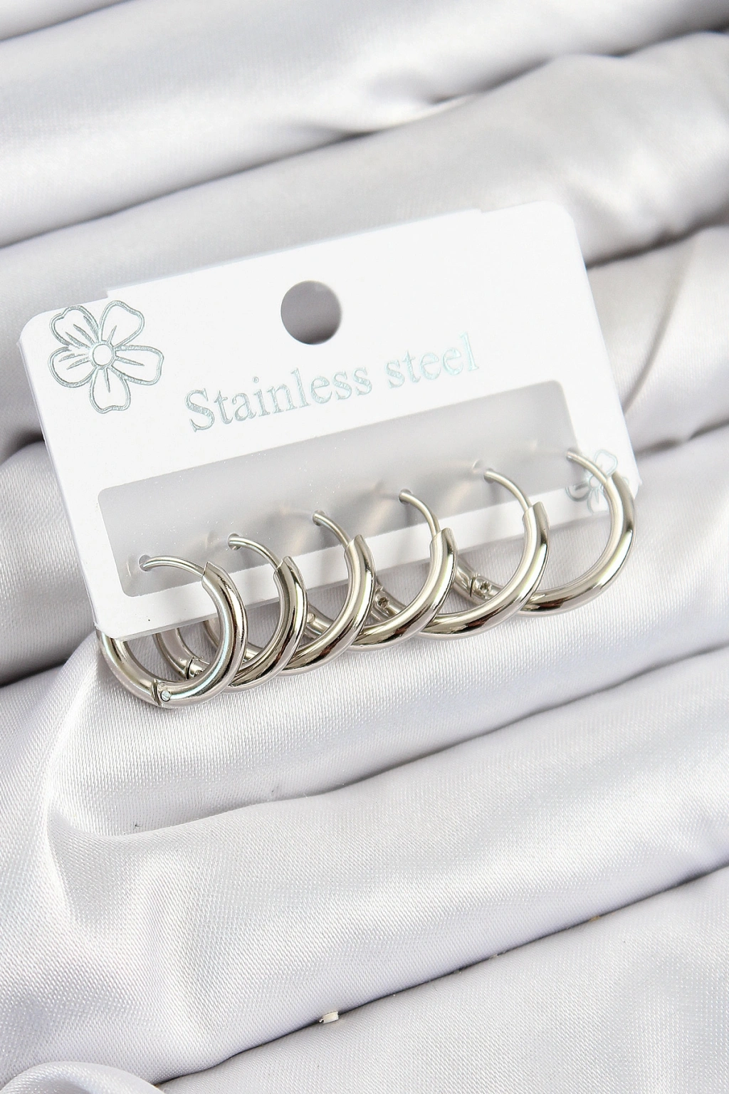 Erb 316L Çelik Halka Model Gümüş Renk 3'lü Set Kadın Küpe