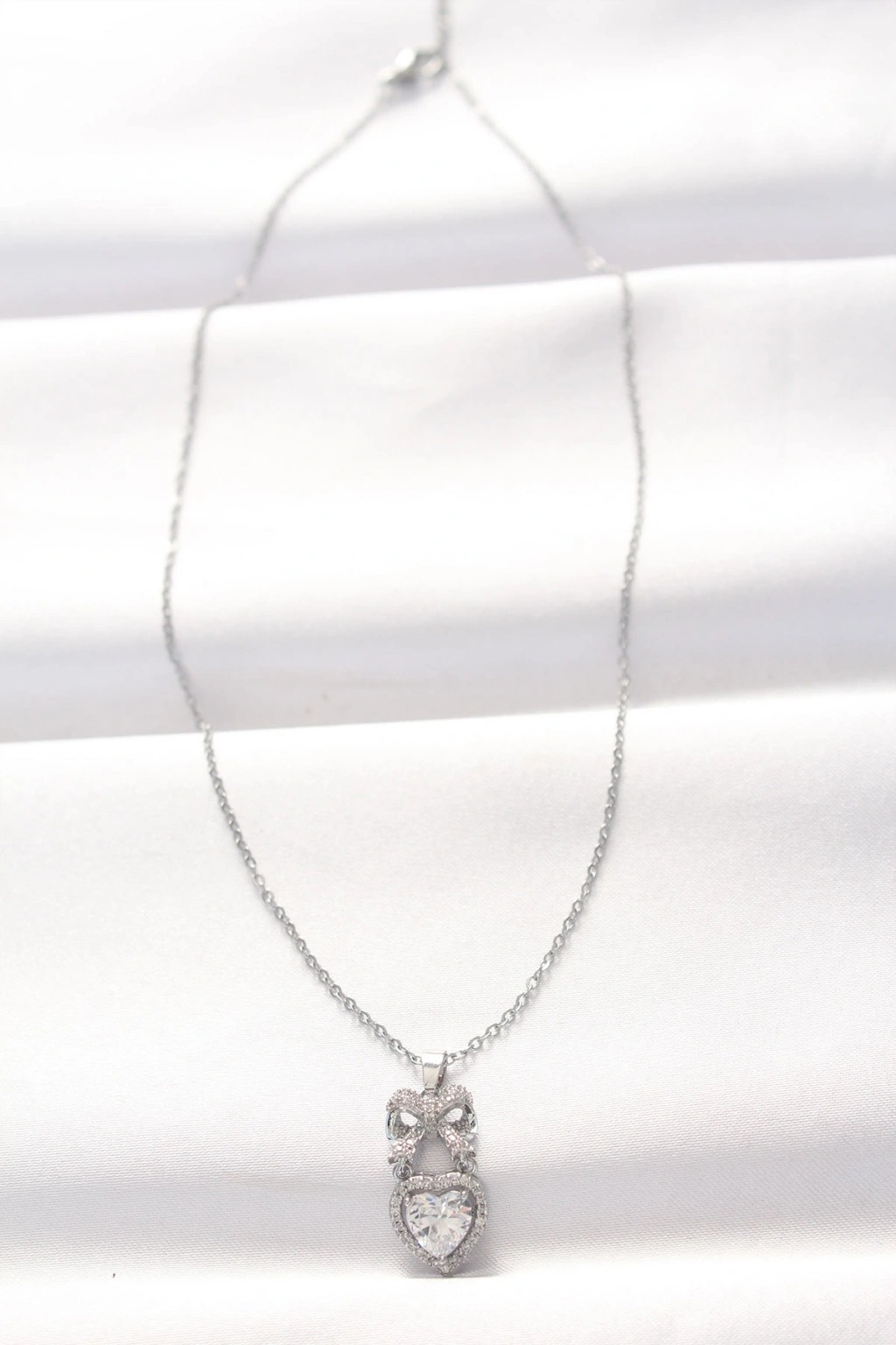Erb 316L Çelik Silver Renk Zirkon Taşlı Kalpli Fiyonk Kolye