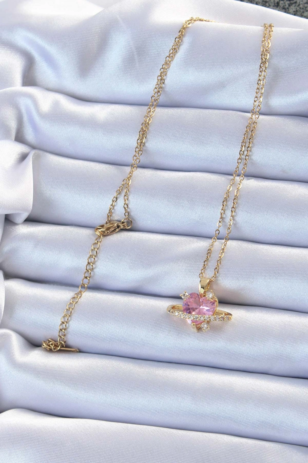 Erb 316L Çelik Zincir Altın Renk Pembe Zirkon Taşlı Satürn Görünümlü Kalp Kolye