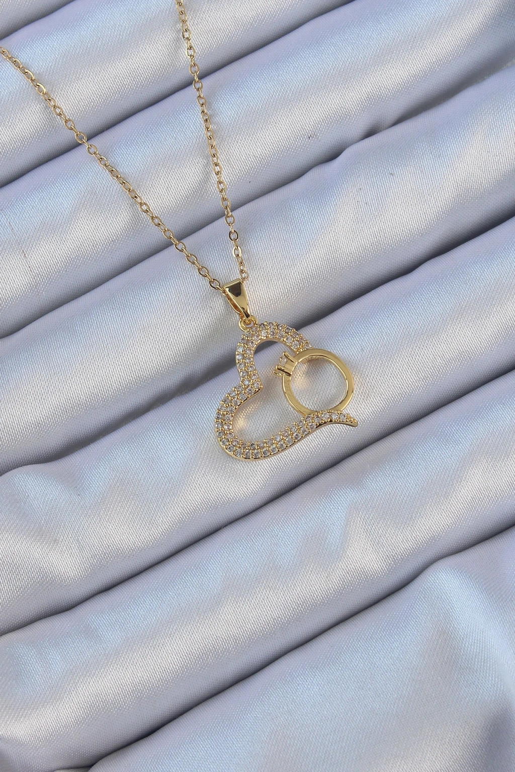 Erb 316L Çelik Zincir Altın Renk Zirkon Taşlı Yüzüklü Kalp Kolye