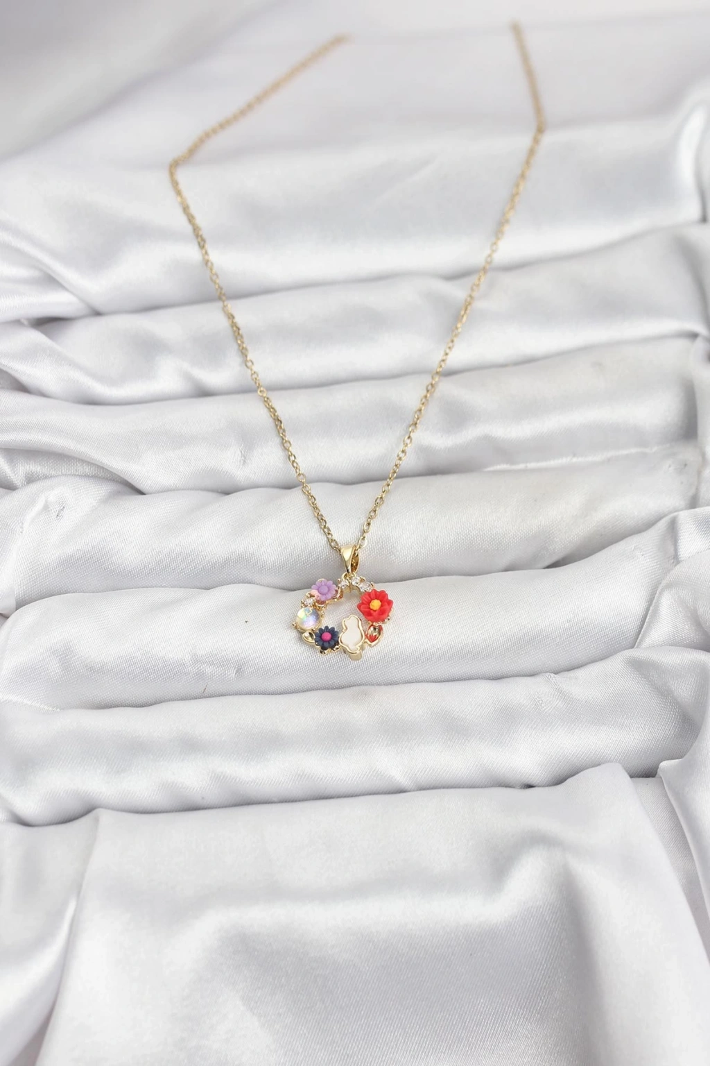 Erb 316L Çelik Zincir Gold Renk Çiçekli Kedili Model Kadın Kolye