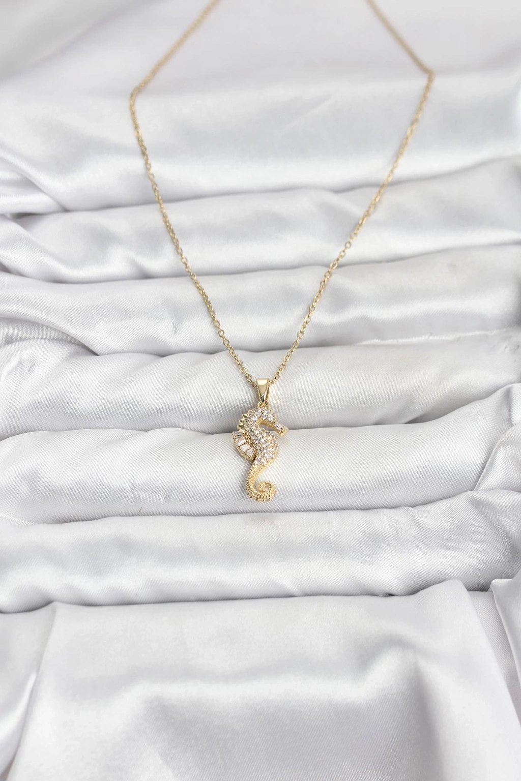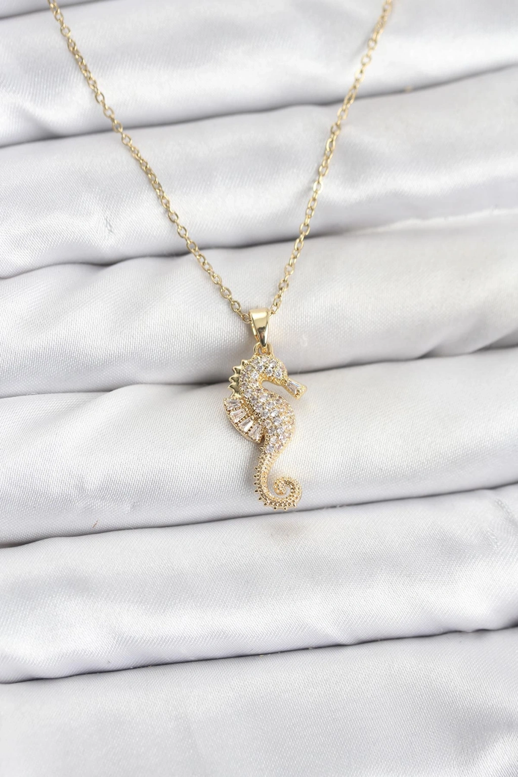 Erb 316L Çelik Zincir Gold Renk Deniz Atı Model Zirkon Taşlı Kadın Kolye