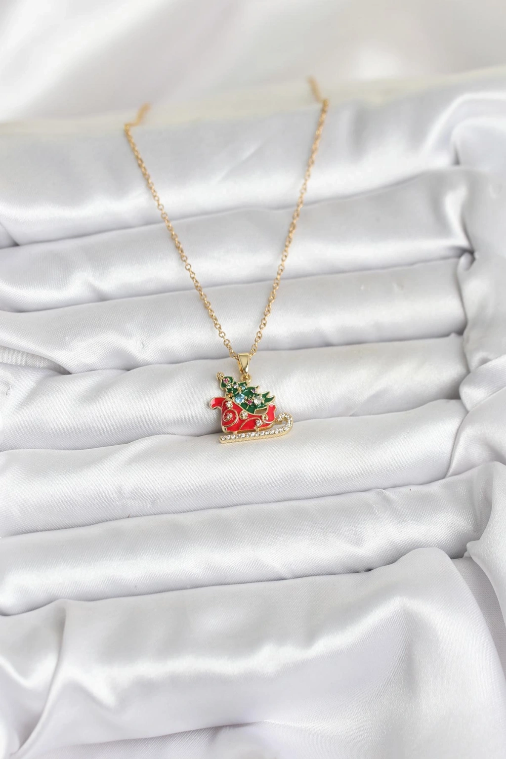 Erb 316L Çelik Zincir Gold Renk Kızak Ve Çam Ağacı Figürlü Yılbaşı Temalı Kadın Kolye