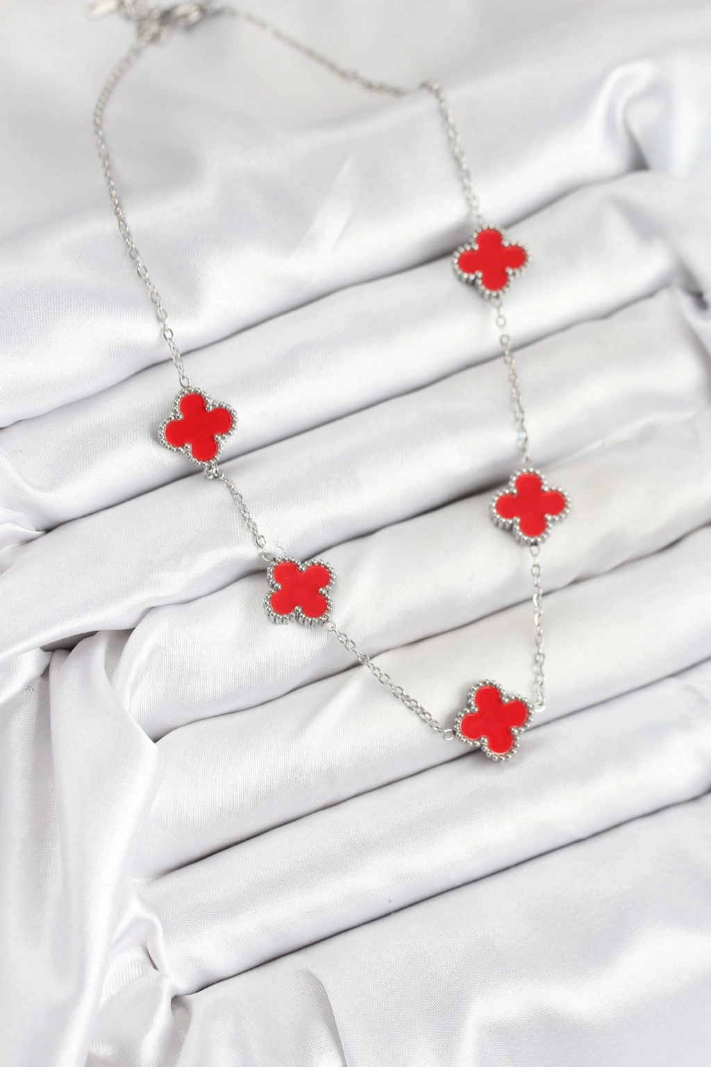 Erb 316L Çelik Zincir Gümüş Kırmızı Renk Yonca Kadın Kolye