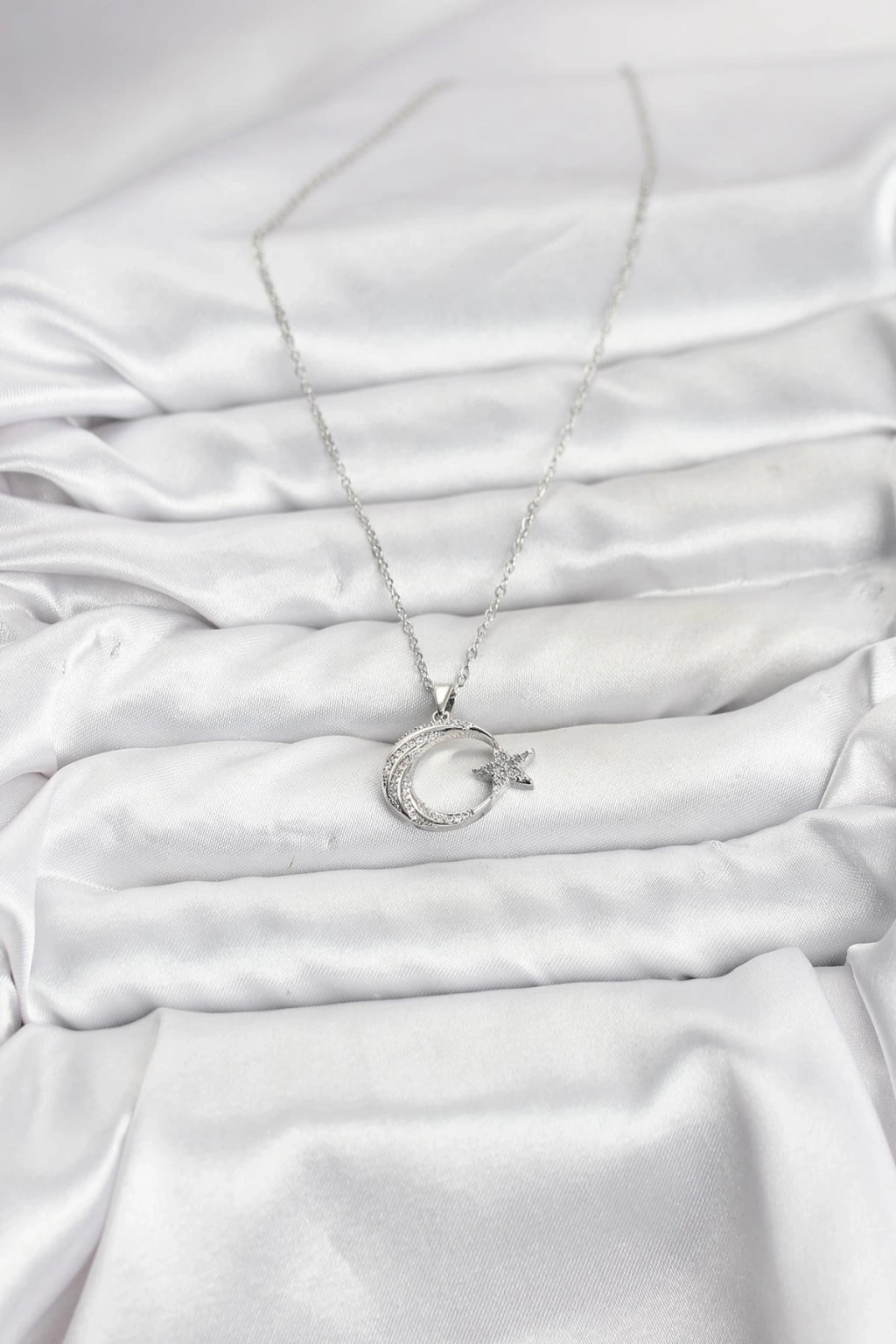 Erb 316L Çelik Zincir Gümüş Renk Ay Yıldız Model Zirkon Taşlı Kadın Kolye
