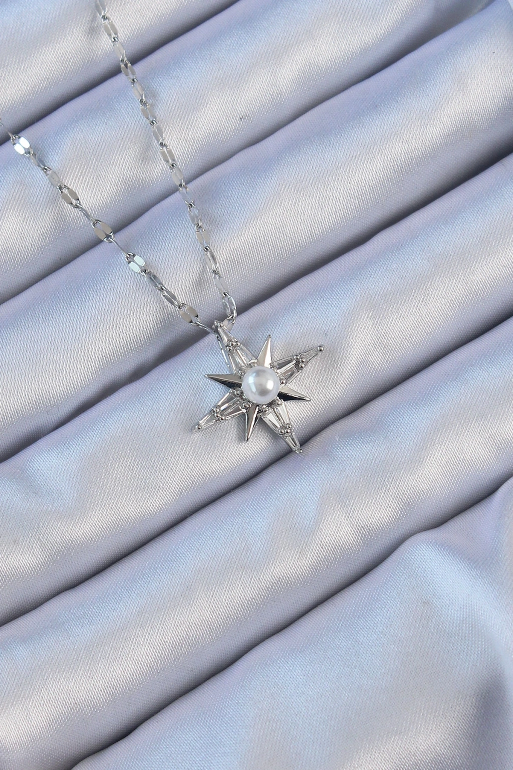 Erb 316L Çelik Zincir Gümüş Renk Baget Taşlı İnci Detay Kutup Yıldızı Kolye