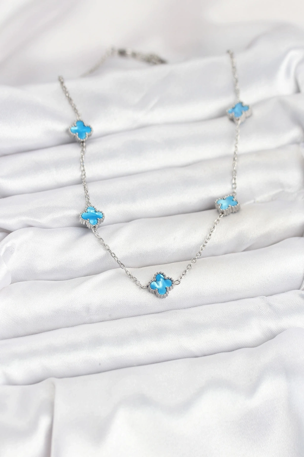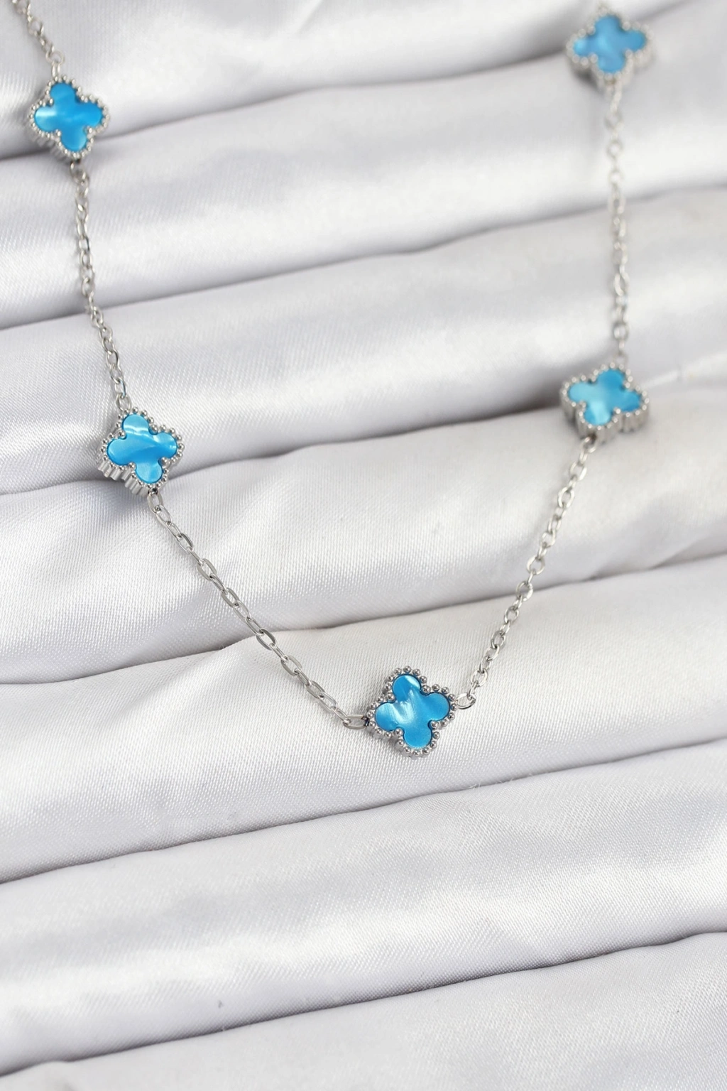 Erb 316L Çelik Zincir Gümüş Renk Buz Mavisi Baby Boy Yonca Kadın Kolye