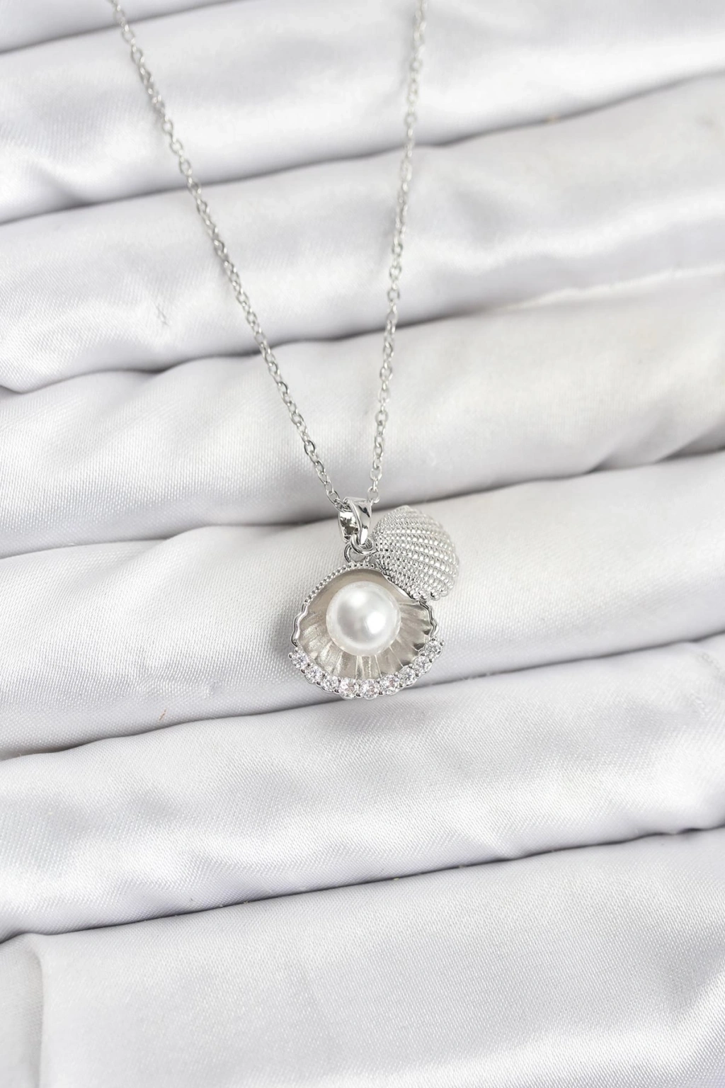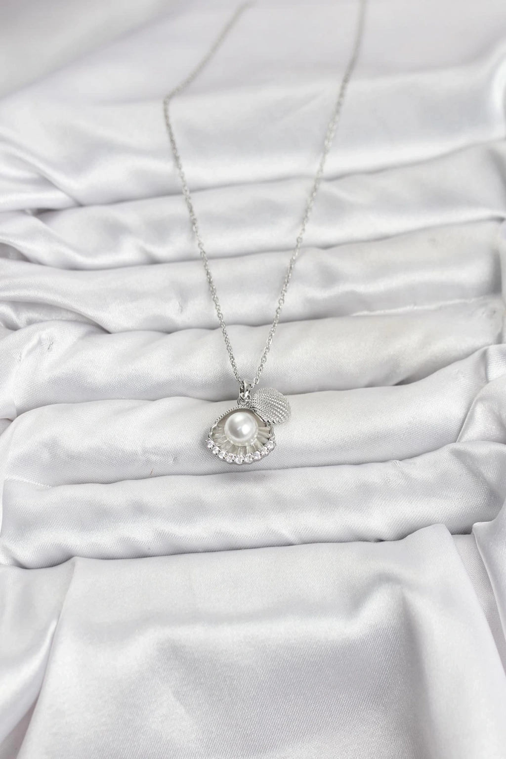 Erb 316L Çelik Zincir Gümüş Renk İncili Deniz Kabuğu Model Zirkon Taşlı Kadın Kolye
