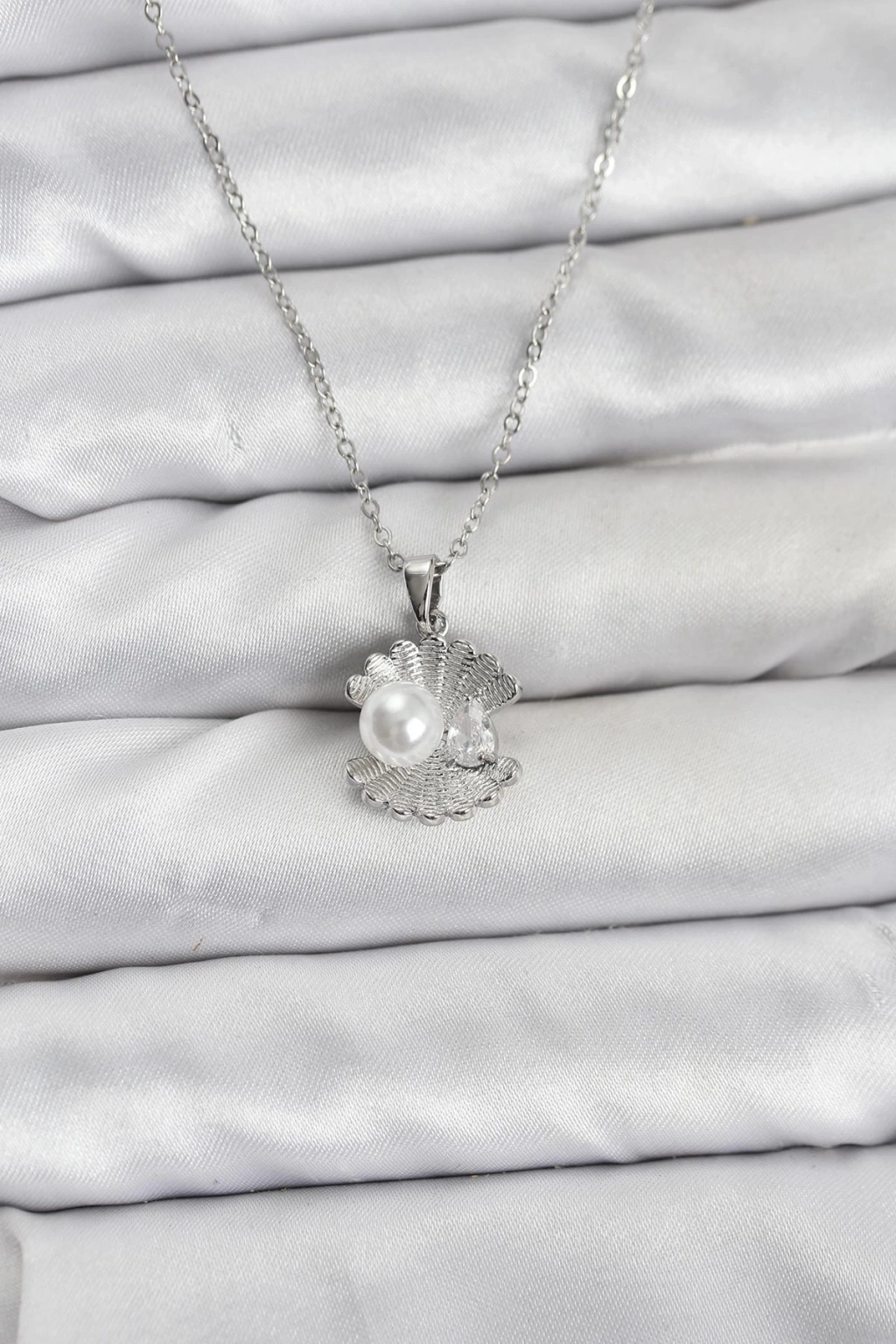 Erb 316L Çelik Zincir Gümüş Renk İstiridye İnci Model Zirkon Taşlı Kadın Kolye