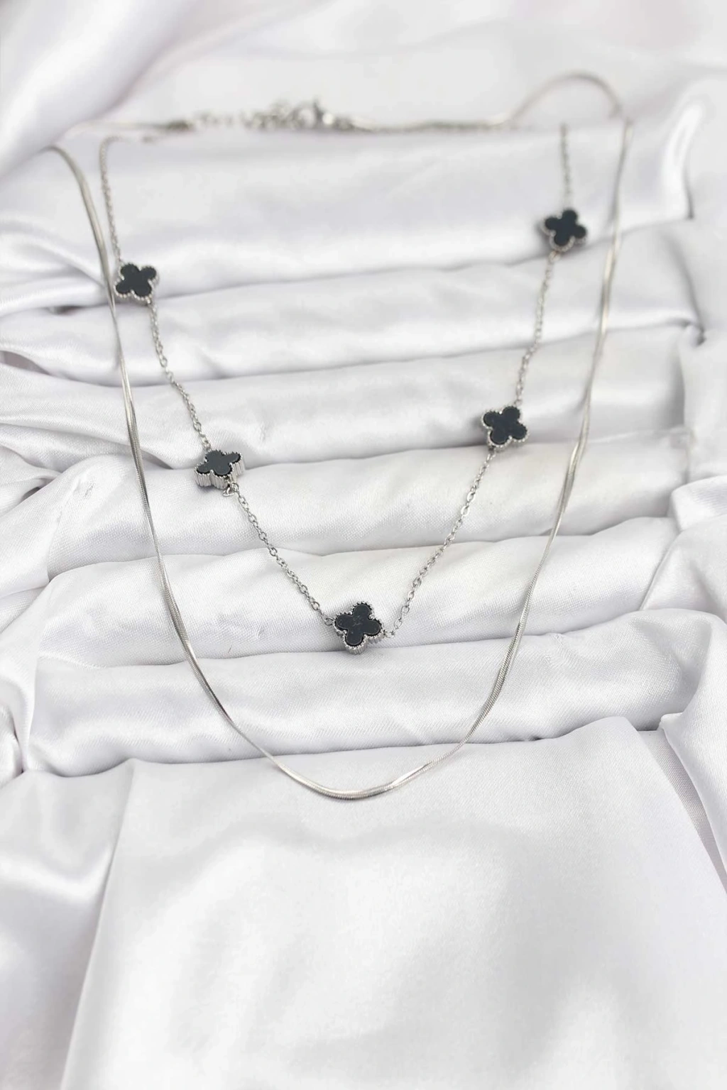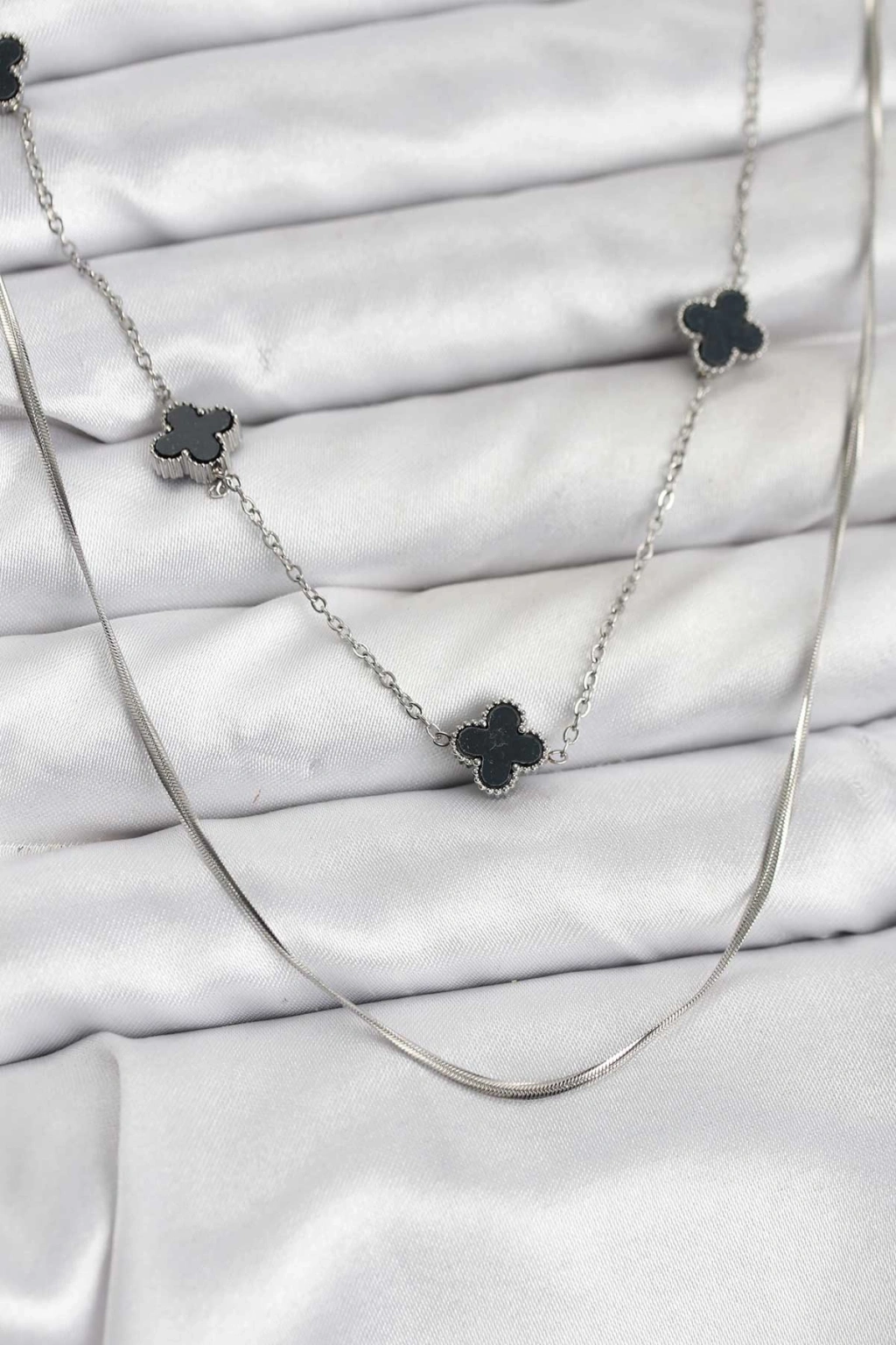 Erb 316L Çelik Zincir Gümüş Renk İtalyan Zincirli Siyah Yonca Model Kadın Kolye