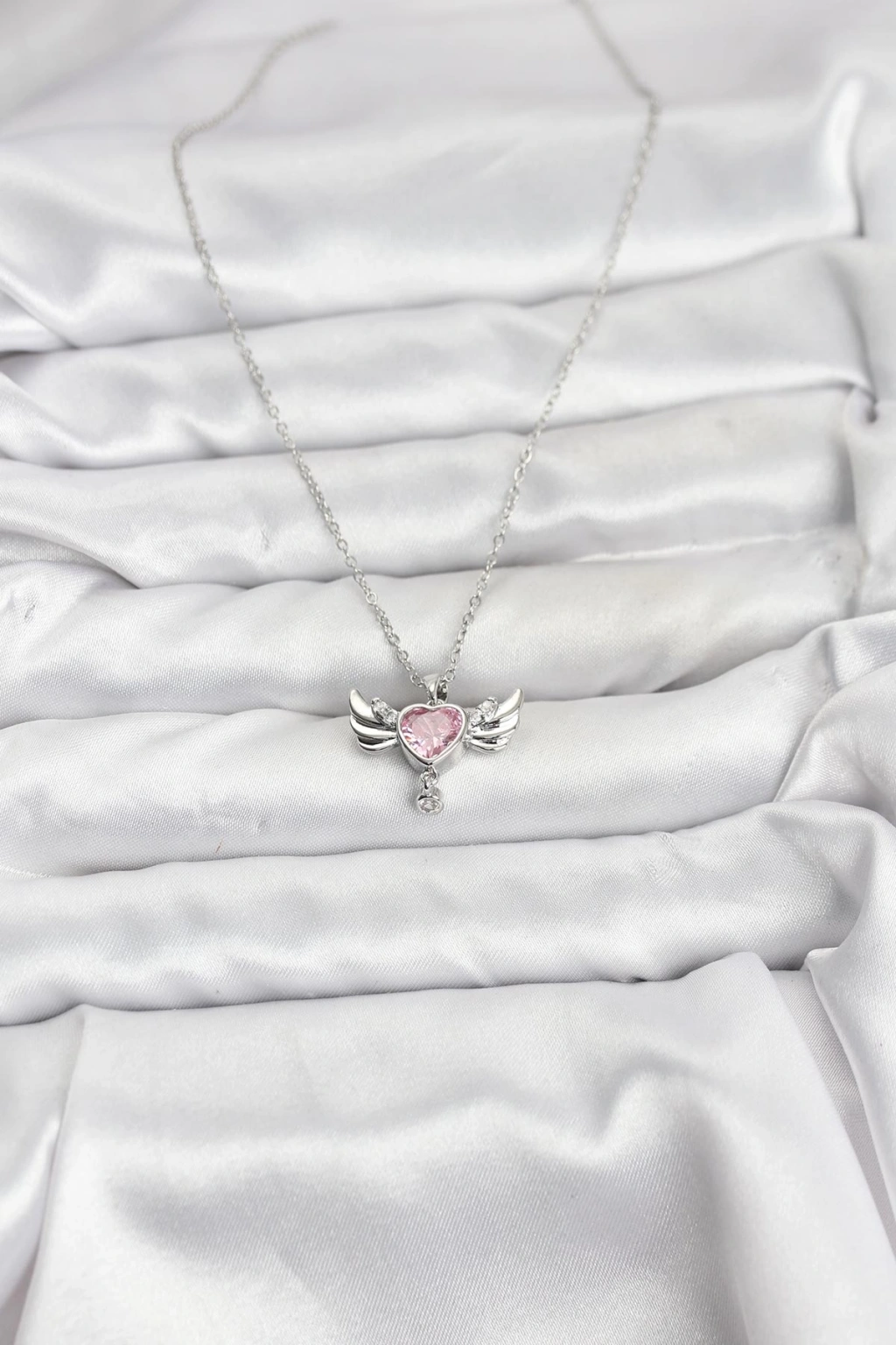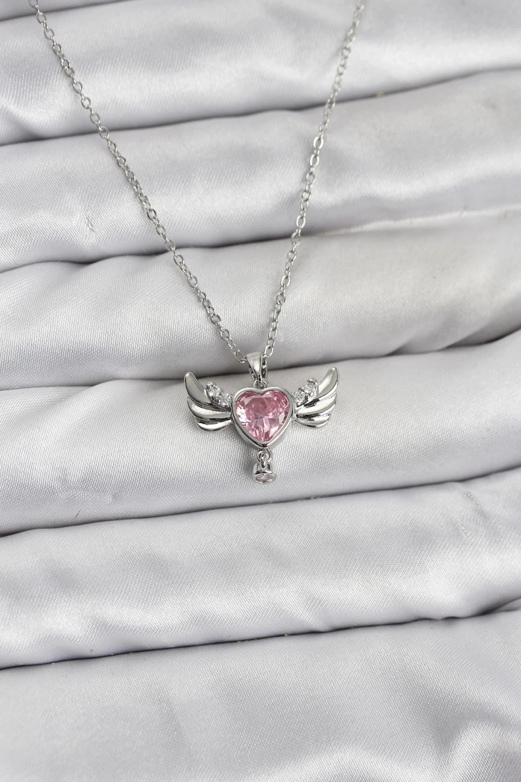Erb 316L Çelik Zincir Gümüş Renk Kanatlı Kalp Model Zirkon Taşlı Kadın Kolye