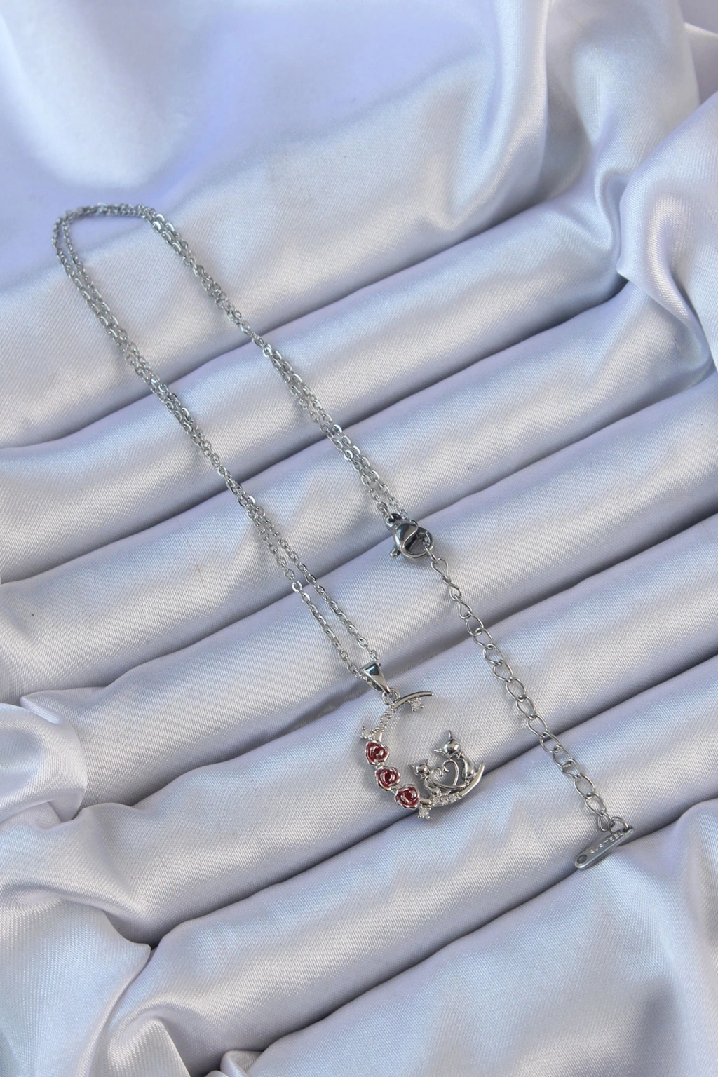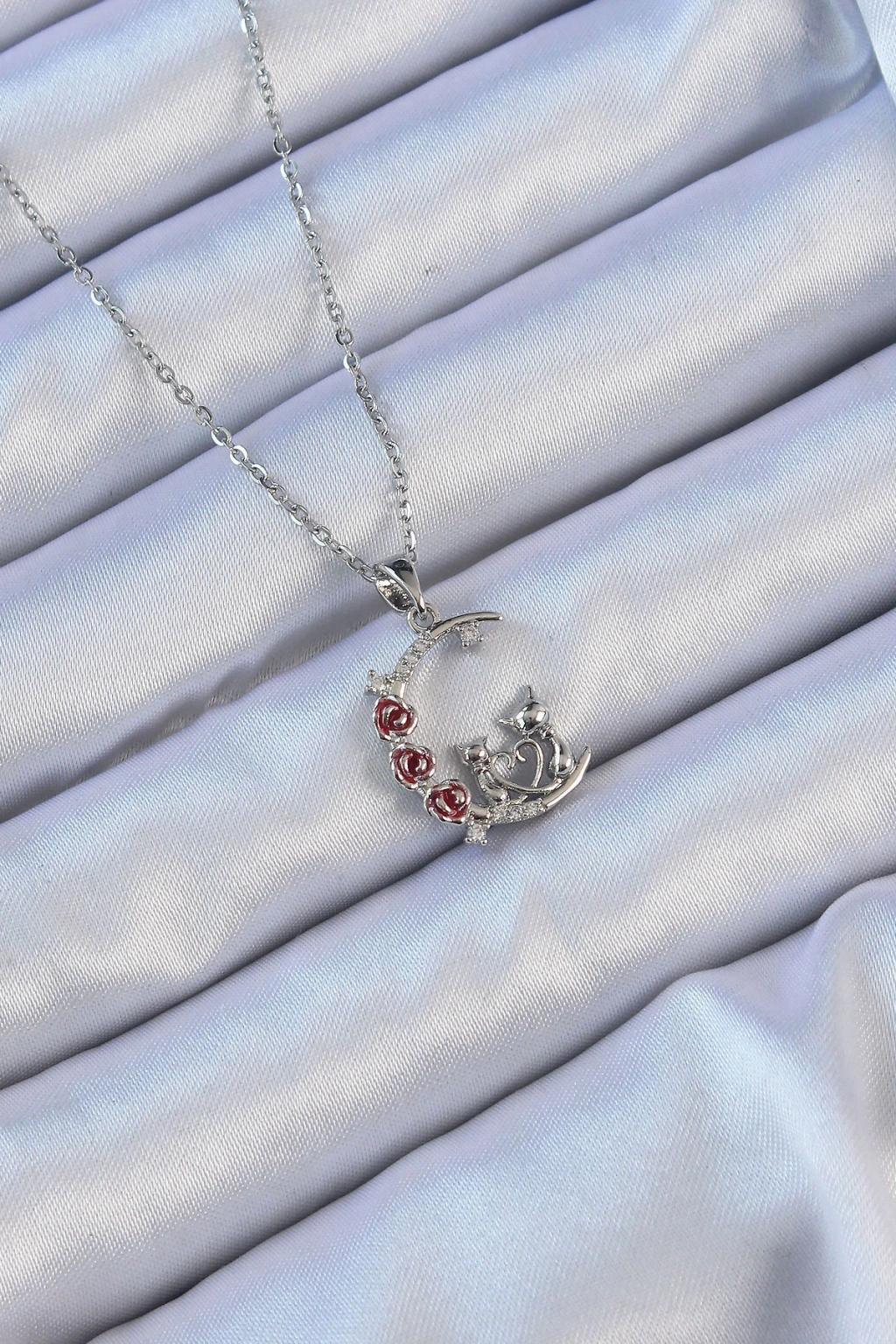 Erb 316L Çelik Zincir Gümüş Renk Kırmızı Gül Detay Kedi Figür Zirkon Taşlı Ay Kolye