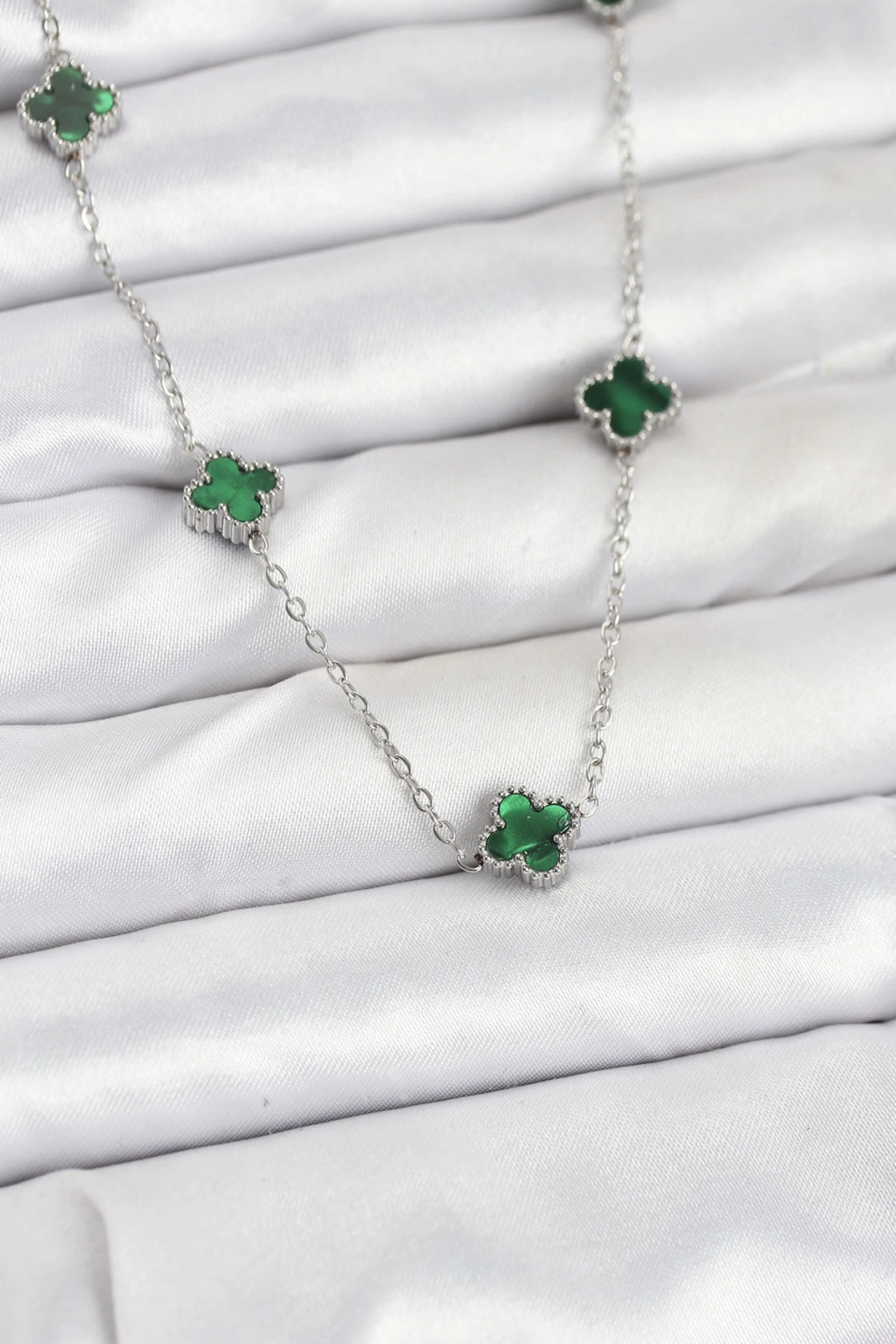 Erb 316L Çelik Zincir Gümüş Renk Yeşil Baby Boy Yonca Kadın Kolye
