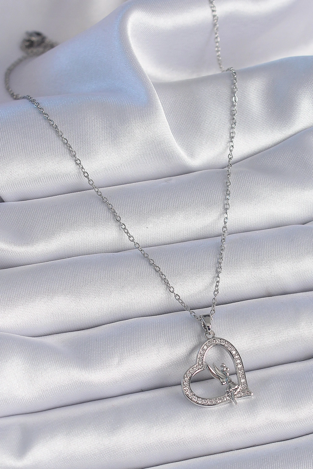 Erb 316L Çelik Zincir Gümüş Renk Zirkon Taşlı Kalp Model Melek Detay Kadın Kolye