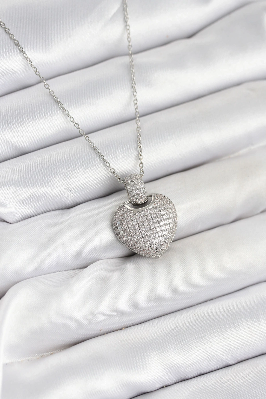 Erb 316L Çelik Zincir Gümüş Renk Zirkon Taşlı Kalpli Kadın Kolye