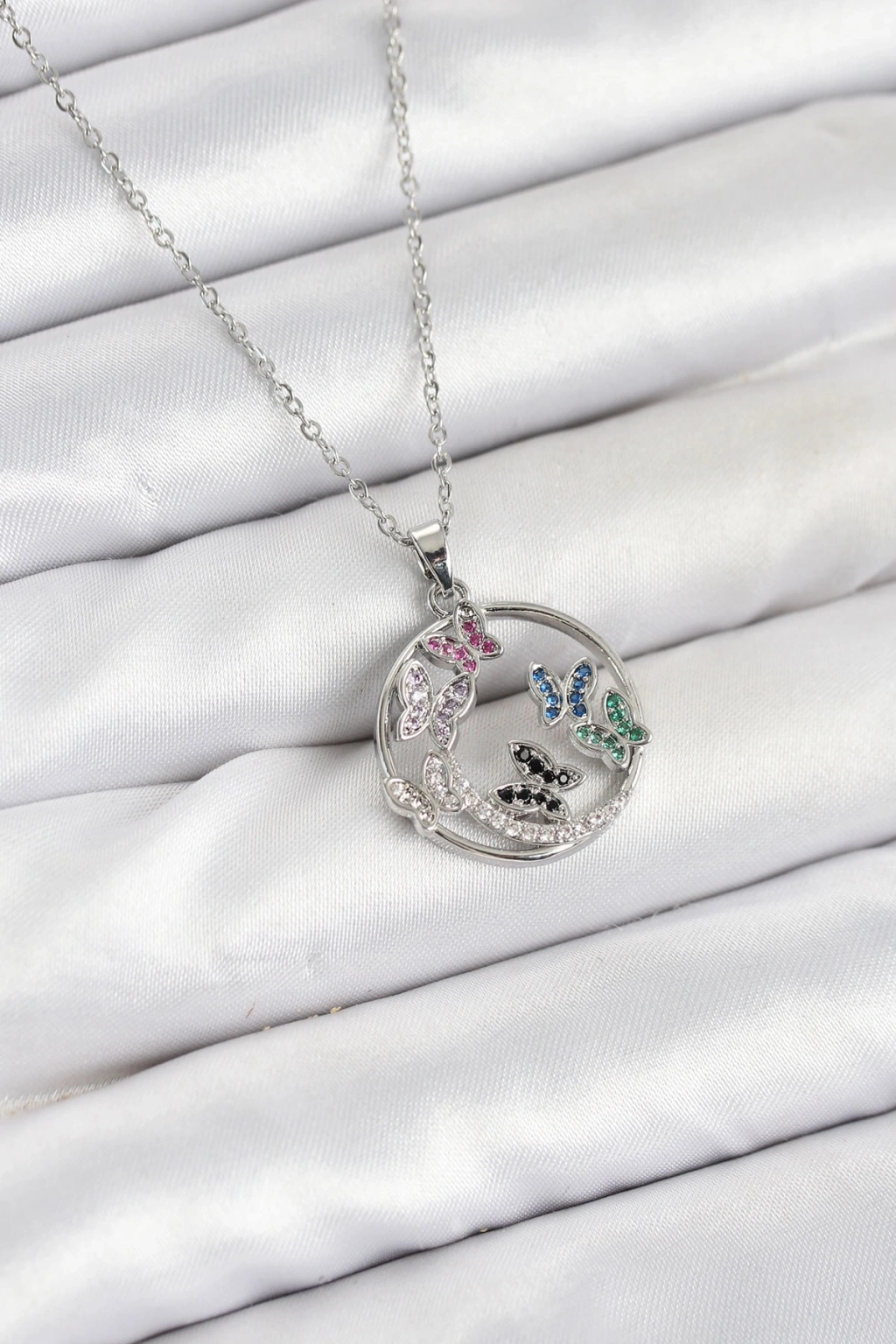 Erb 316L Çelik Zincir Gümüş Renk Zirkon Taşlı Kelebekli Kadın Kolye