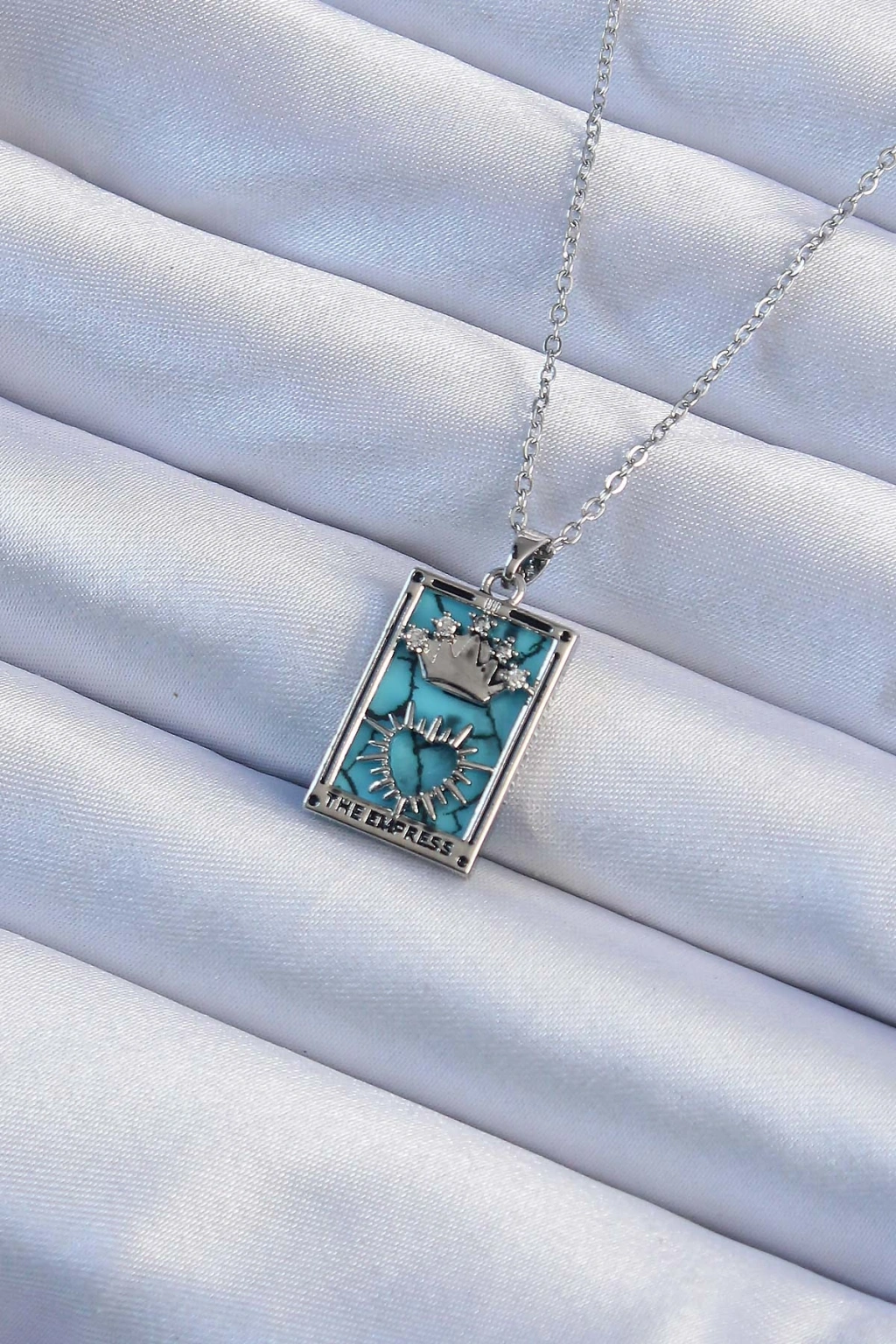 Erb 316L Çelik Zincir Gümüş Renk Zirkon Taşlı Mavi Mermer Desenli Taç Model Tarot Kolye