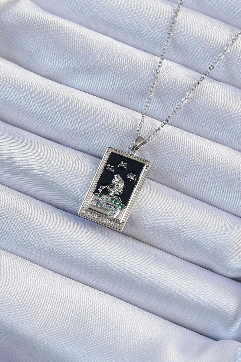 Erb 316L Çelik Zincir Gümüş Renk Zirkon Taşlı Siyah Mineli Kız Figürlü Tarot Kolye