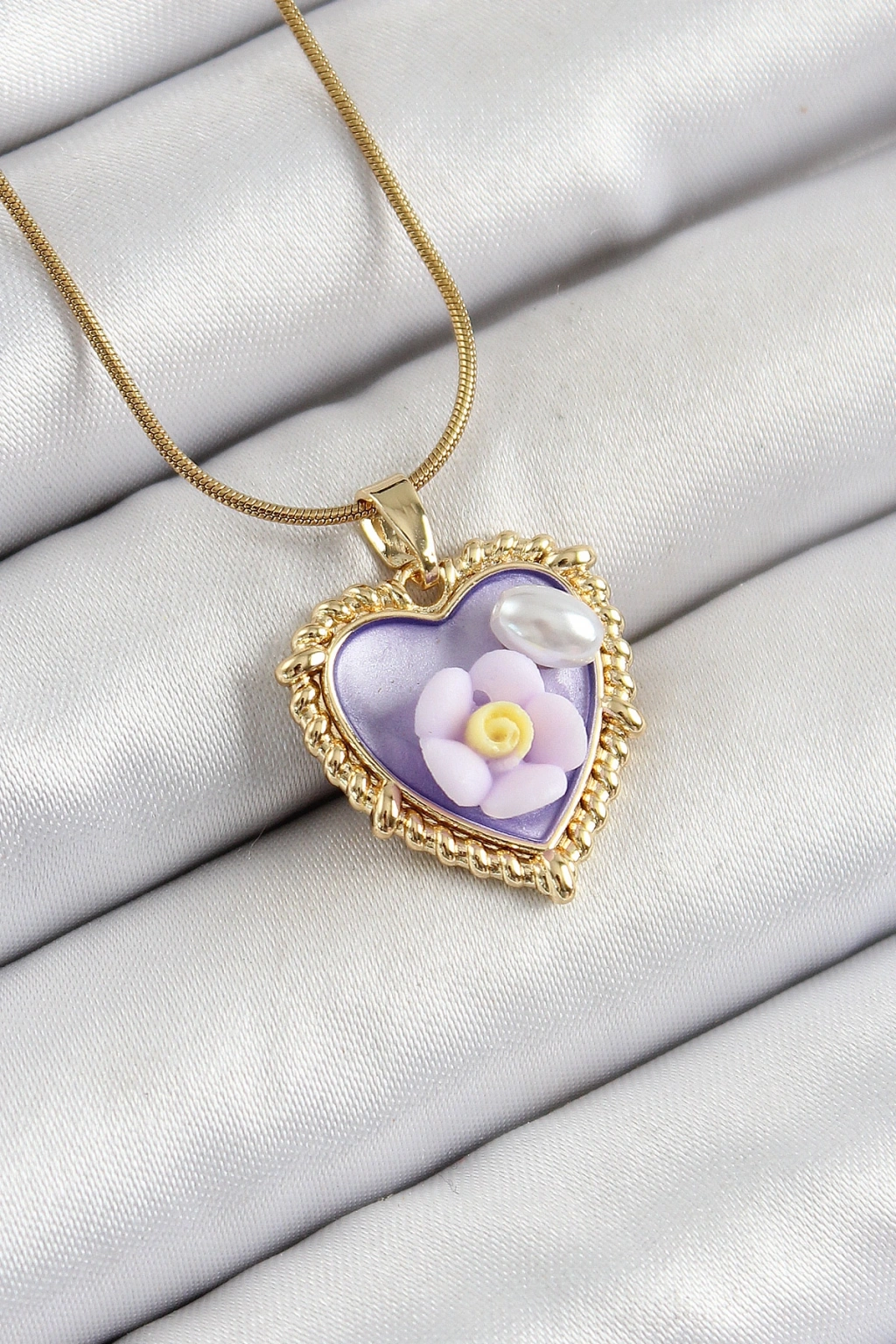 Erb 316L Çelik Zincir Mor Sanatsal Portre İnci Detaylı Papatya Figürlü Kalp Model Gold Renk Kadın Kolye