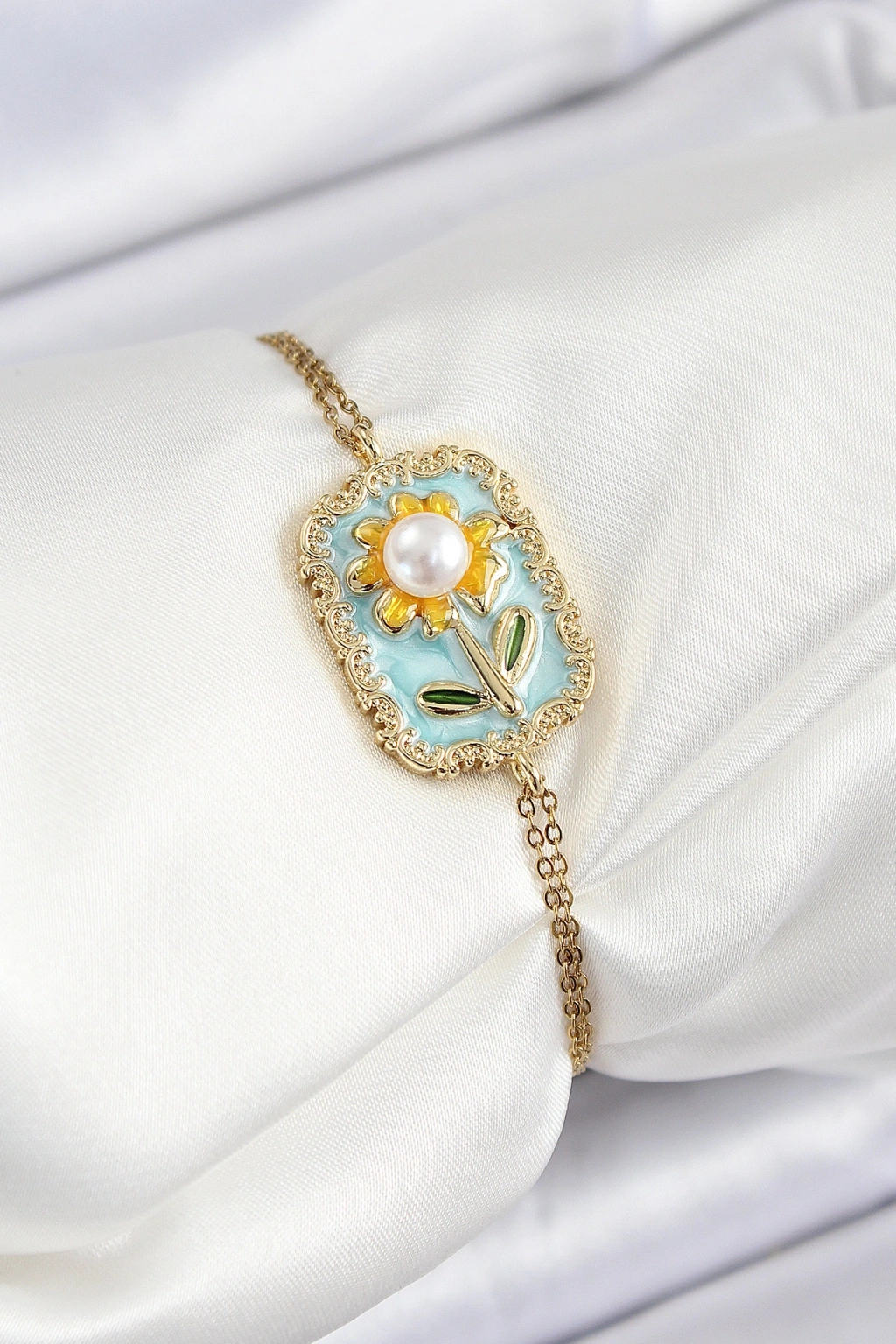 Erb 316L Çelik Zincir Turkuaz Mineli Sanatsal Portre İnci Detaylı Papatya Model Gold Renk Kadın Bileklik