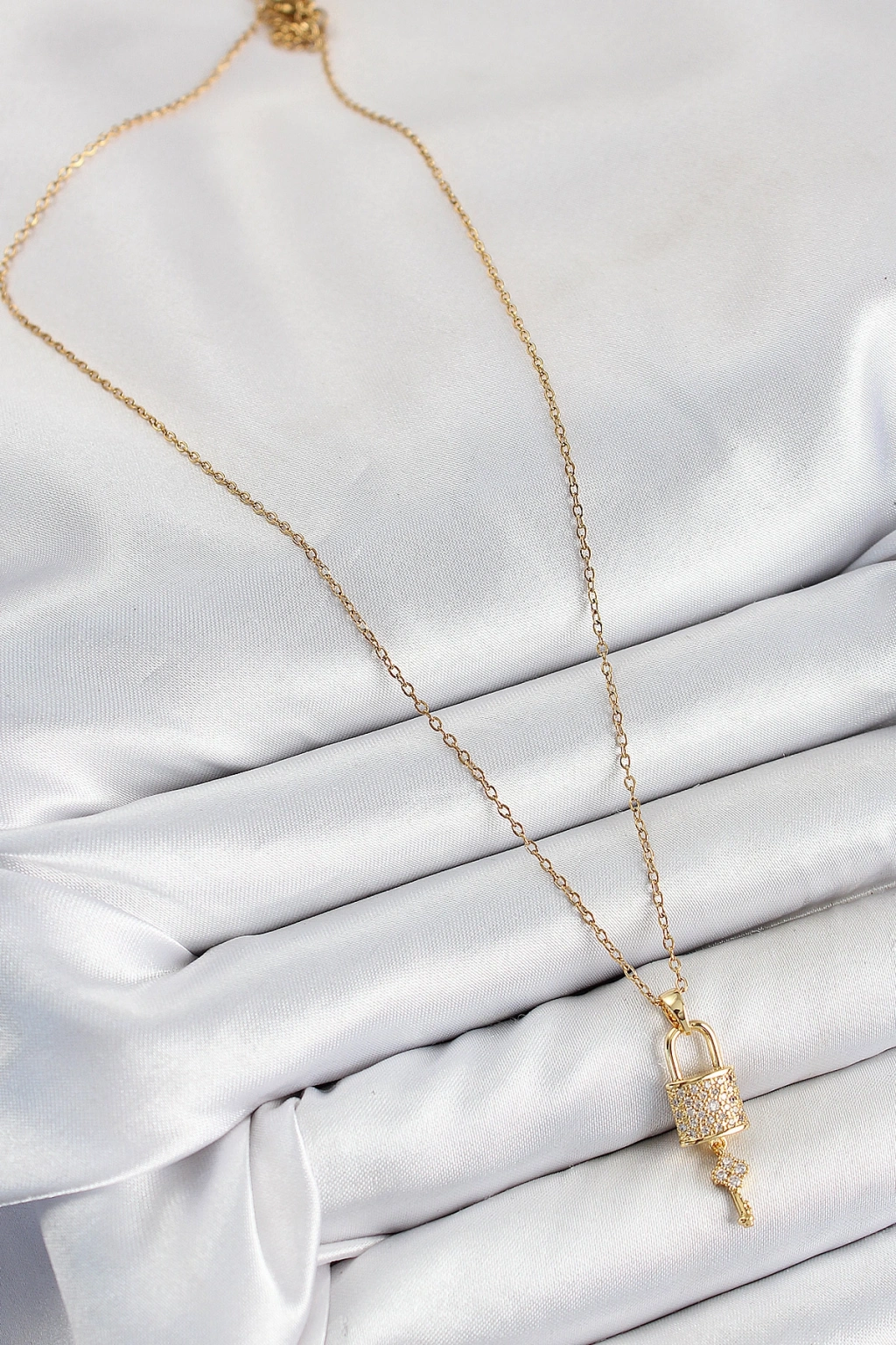 Erb 316L Çelik Zirkon Taşlı Kilit Ve Sallantılı Anahtar Model Gold Renk Kadın Kolye