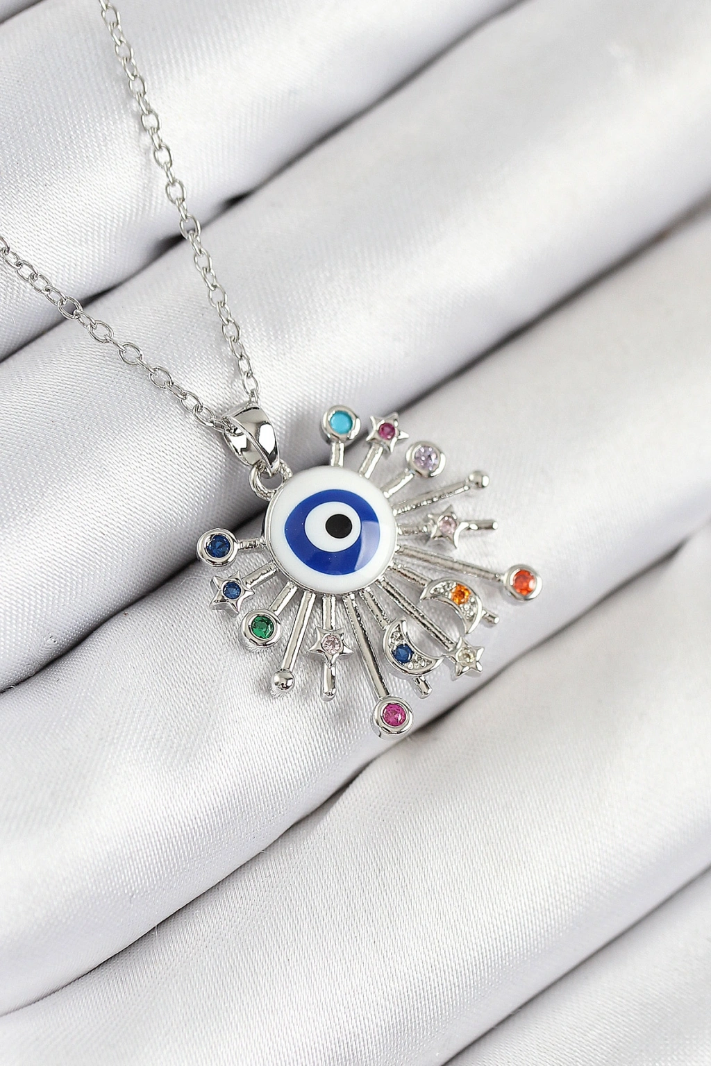 Erb 316L Çelik Zirkon Taşlı Nazar Model Gümüş Renk Kadın Kolye