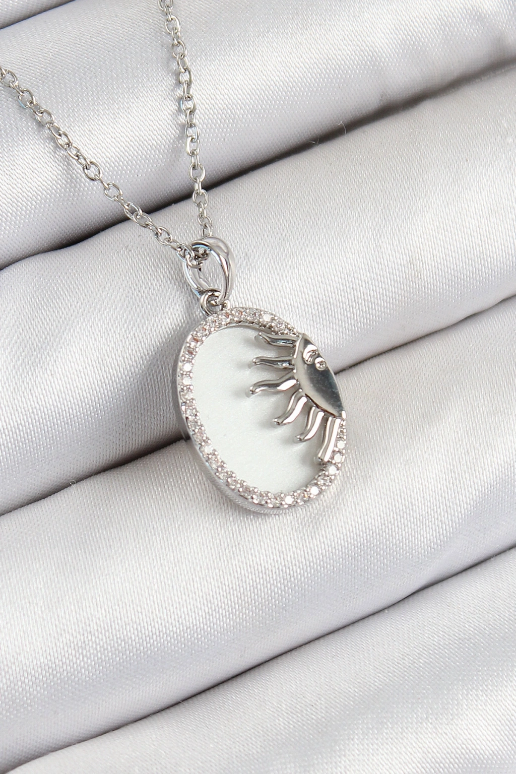 Erb 316L Çelik Zirkon Taşlı Yarım Güneş Model Gümüş Renk Kadın Kolye