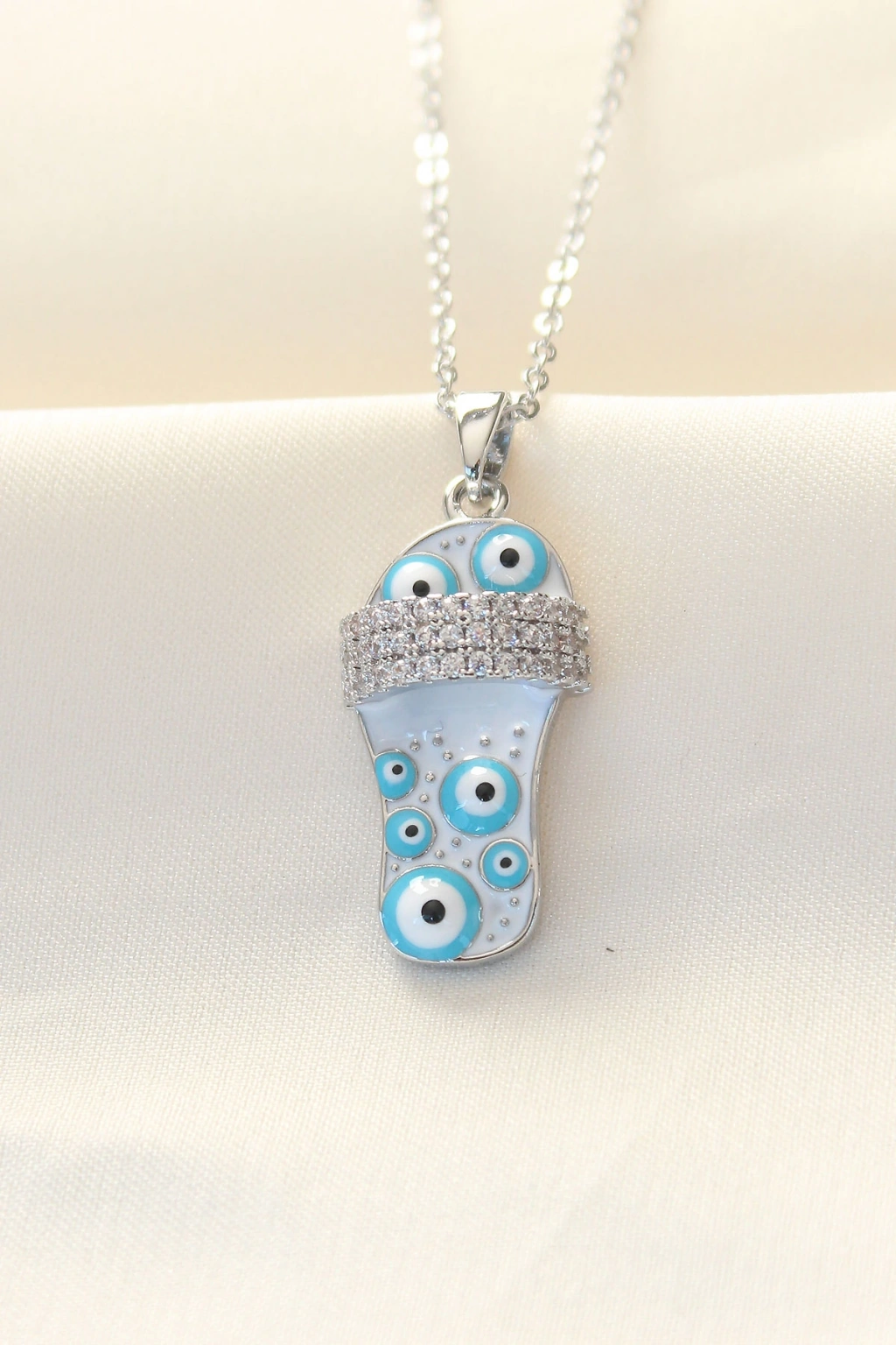 Erb 316L Zinciri Çelik Zirkon Taşlı Gümüş Renk Nazar Boncuklu Terlik Kolye