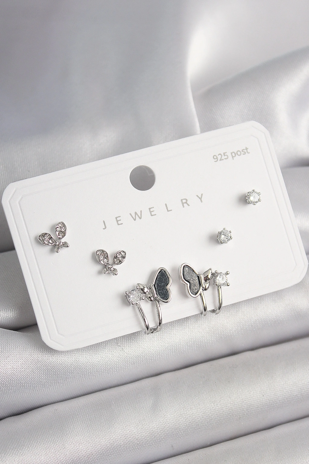 Erb 925 Ayar Gümüş Çivi Pirinç Gümüş Renk Zirkon Taşlı Kelebek Model Kadın Küpe Seti