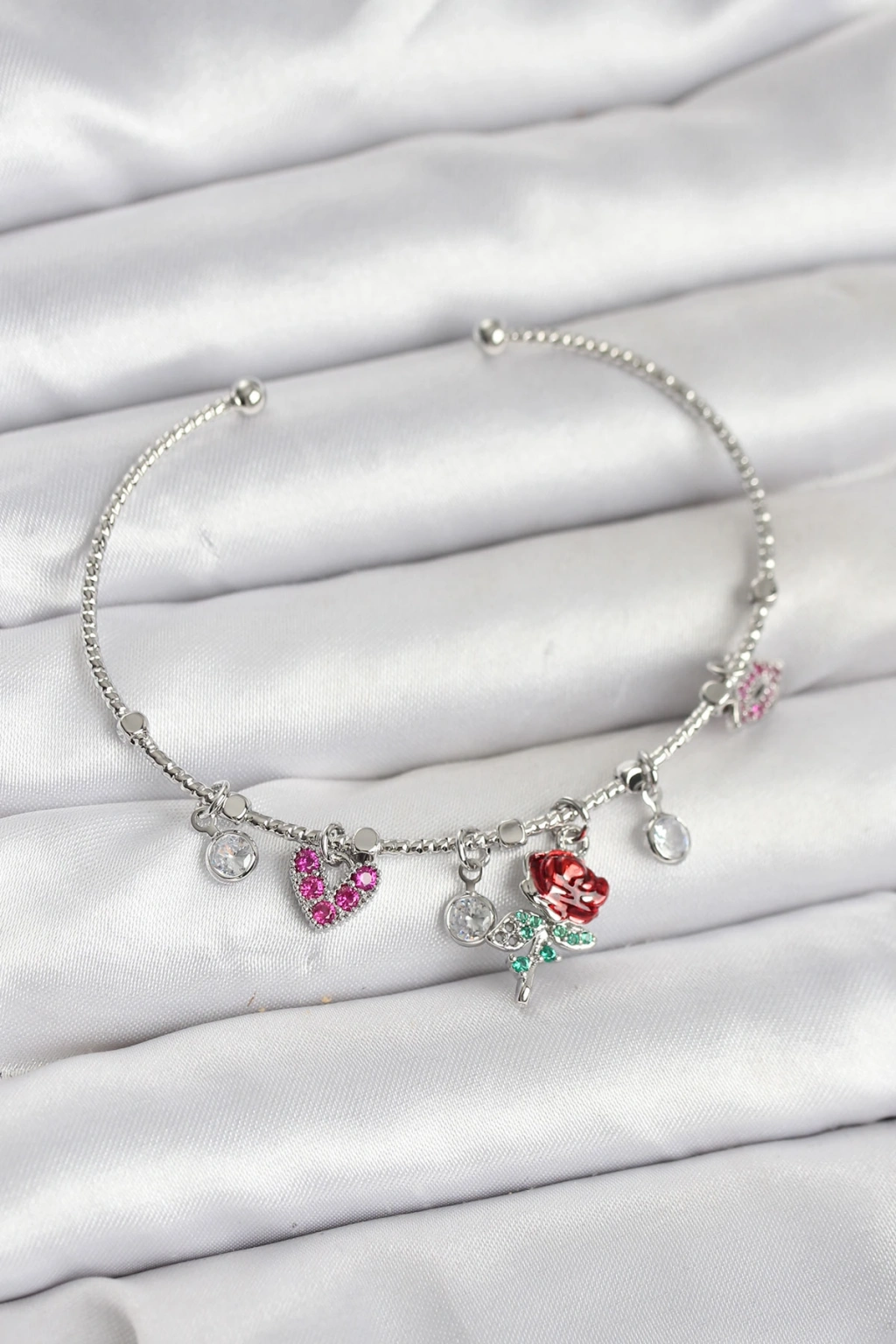 Erb Gül Charmlı Gümüş Renk Pirinç Kadın Bileklik