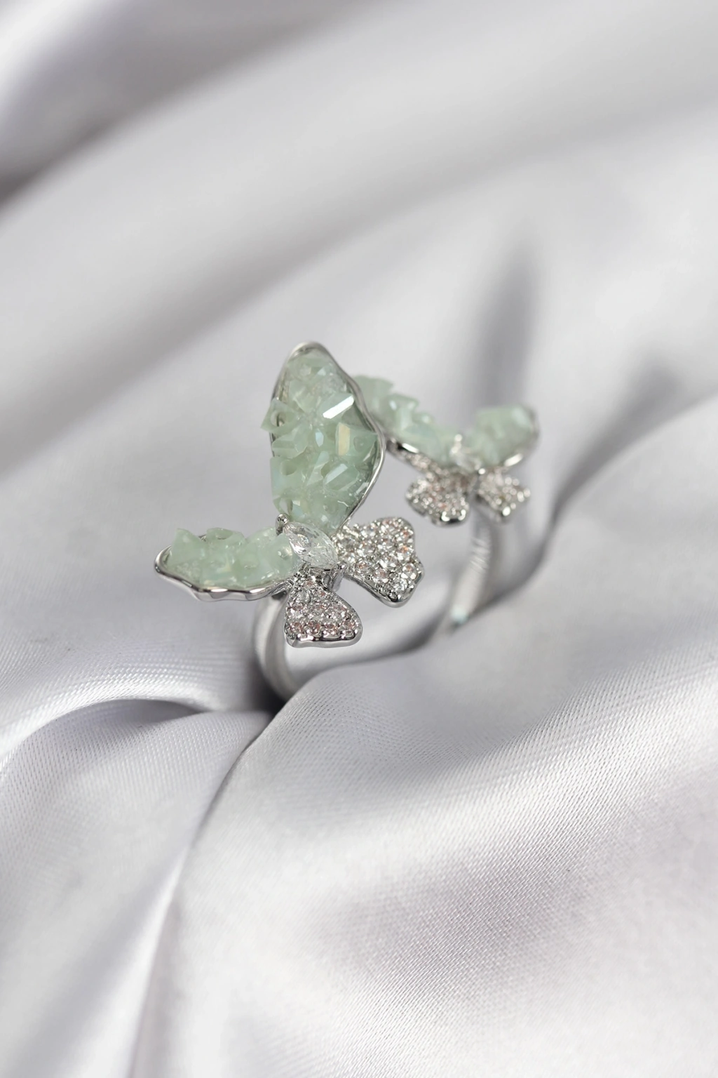 Erb Gümüş Renk Su Yeşili Kelebek Model Zirkon Taşlı Kadın Yüzük