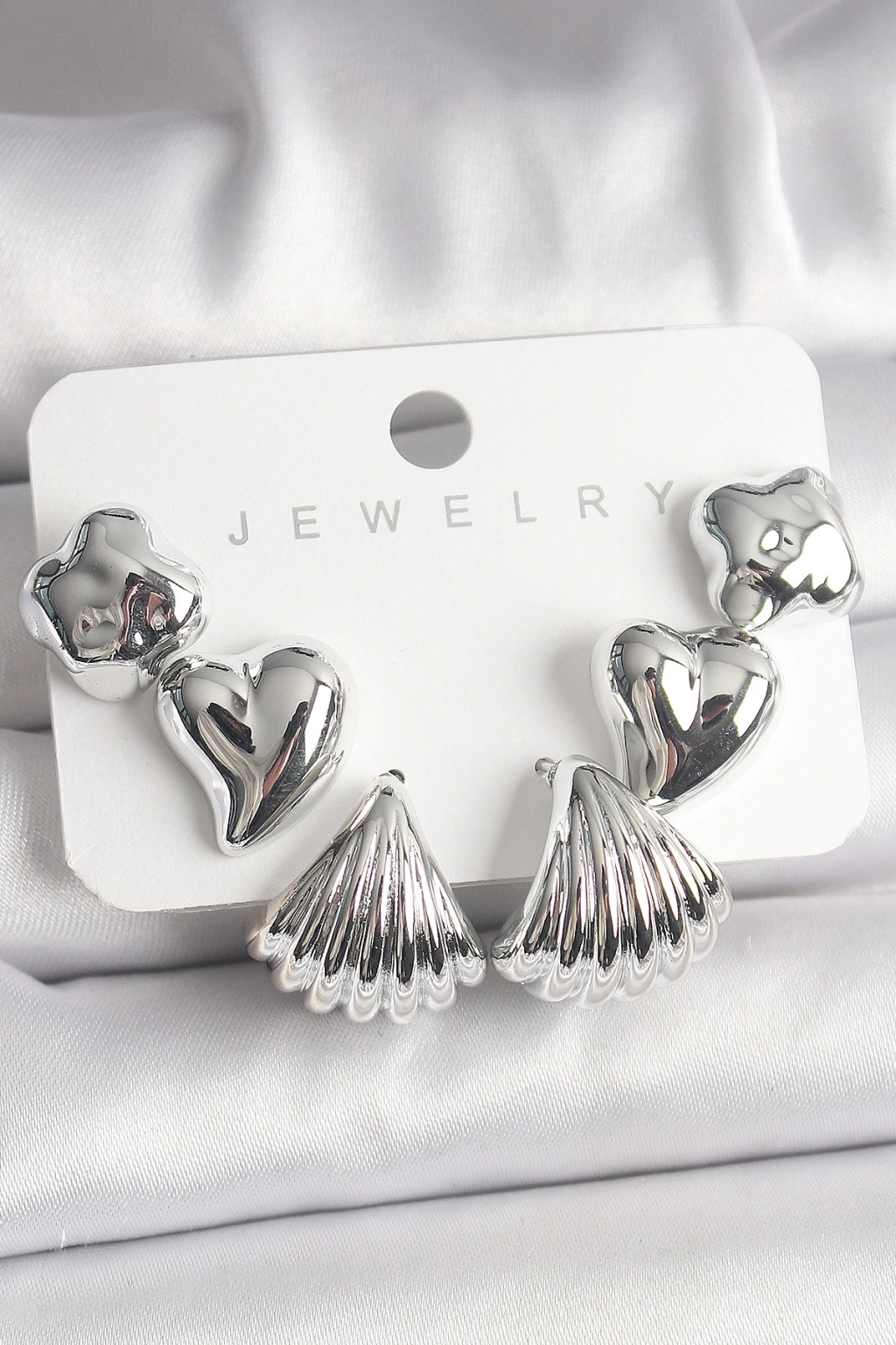 Erb Gümüş Renk Yonca Kalp Deniz Kabuğu Figür CCB Kadın Küpe Seti