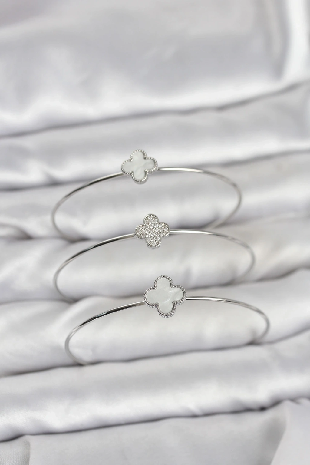Erb Gümüş Renk Yonca Model Zirkon Taşlı 3'lü Kadın Bileklik Kombini