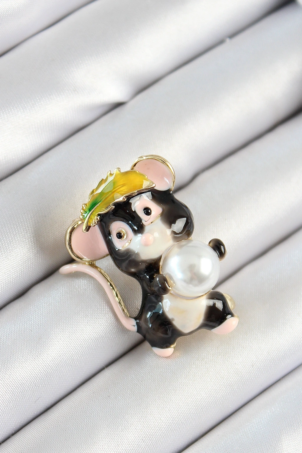 Erb İnci Detaylı Siyah Ve Pembe 3D Sevimli Fare Figürlü Gold Renk Kadın Broş