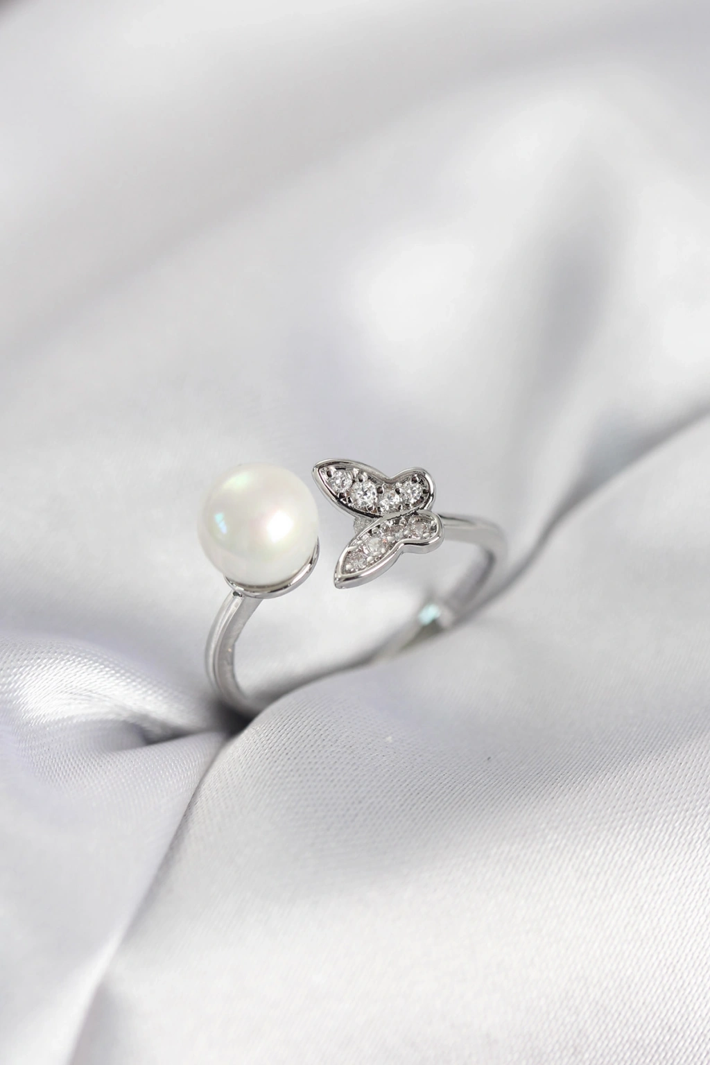 Erb Kelebek İncili Model Gümüş Renk Zirkon Taşlı Kadın Yüzük