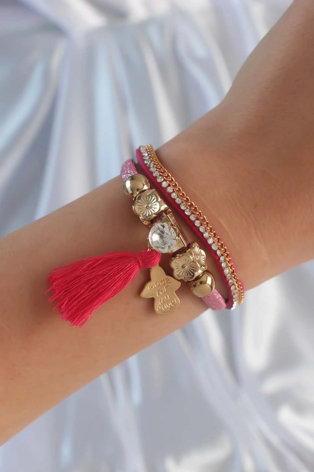 Erb Pembe Renk Zirkon Taşlı Püskül Detay Deri Çoklu Bileklik