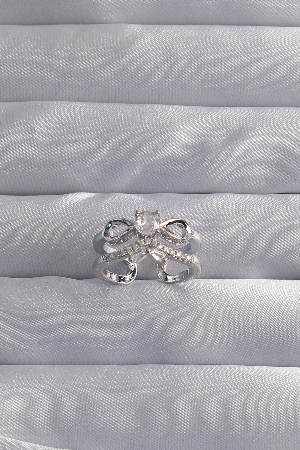 Erb Pirinç Ayarlamalı Gümüş Renk Zirkon Taşlı 2li Görünüm Fiyonk Yüzük