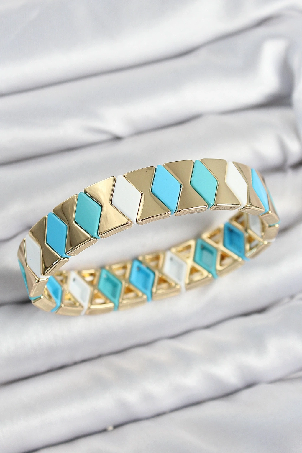 Erb Pirinç Baklava Desenli Mavi Beyaz Gold Renk Lastikli Kadın Bileklik