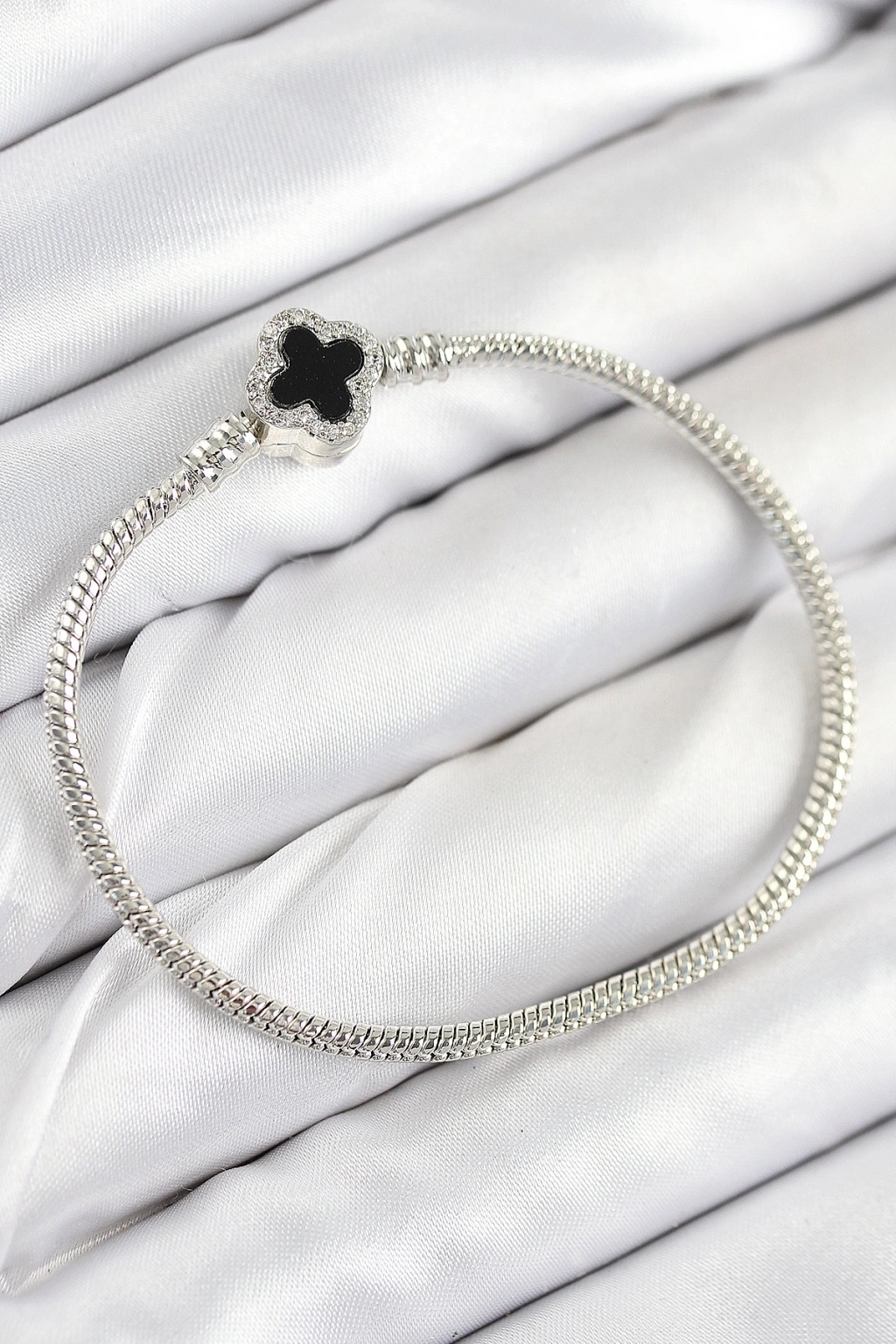 Erb Pirinç Charm Zirkon Taşlı Yonca Model Gümüş Renk Kadın Bileklik