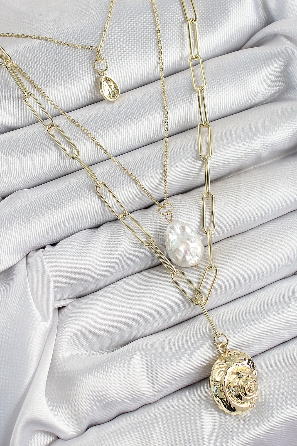 Erb Pirinç Çoklu Zincirli İncili Deniz Kabuğu Model Gold Renk Kadın Kolye
