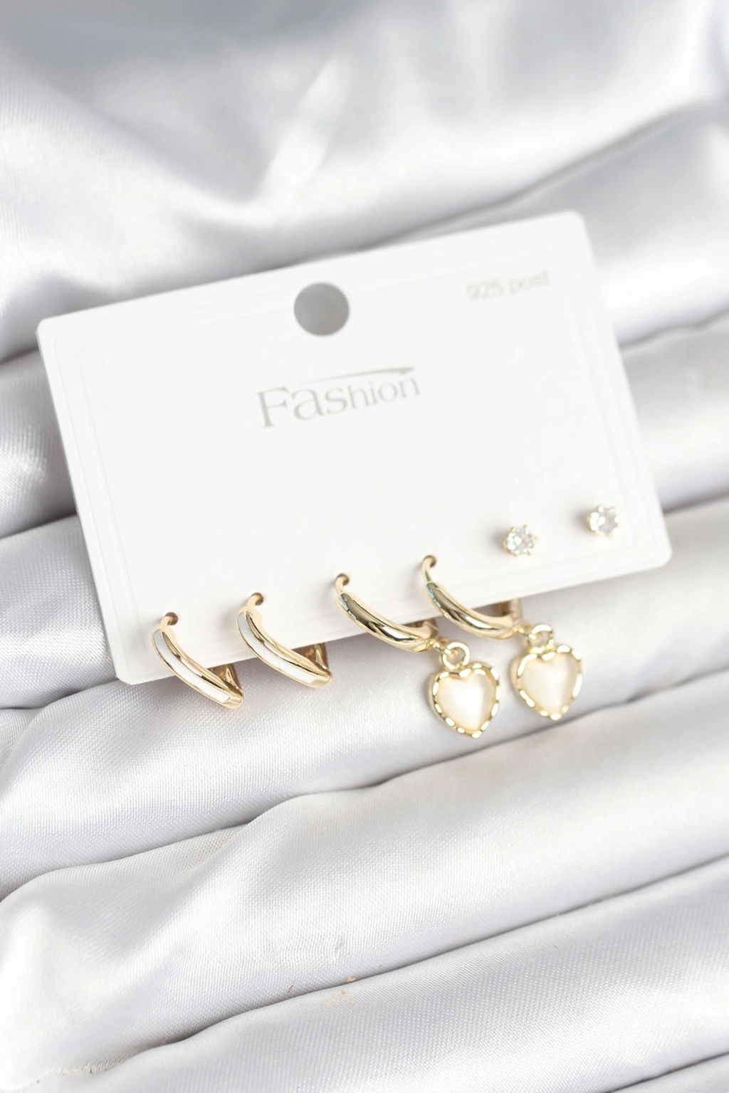 Erb Pirinç Gold Renk Kalp Detaylı 925 Ayar Gümüş Çivili Kadın Küpe Seti