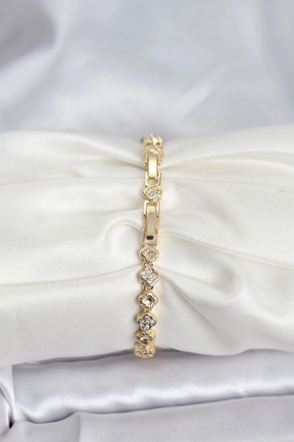 Erb Pirinç Gold Renk VIP Seri Sıralı Yonca Model Zirkon Taşlı Kadın Bileklik