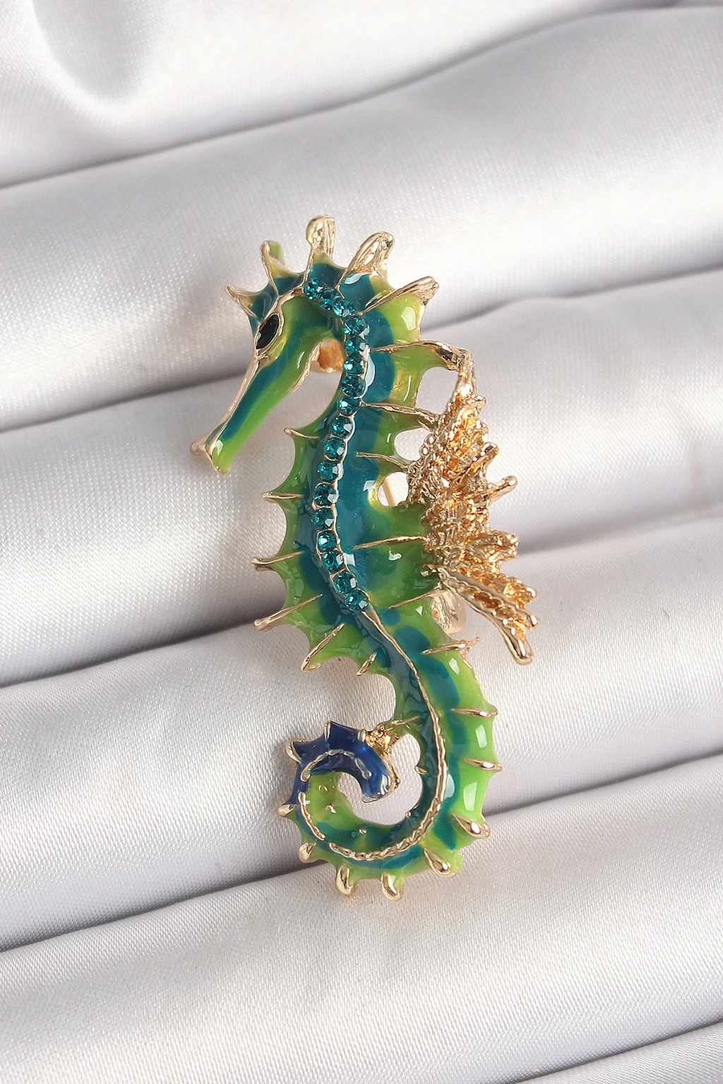 Erb Pirinç Gold Renk Yeşil Deniz Atı Model Zirkon Taş Detay Kadın Broş