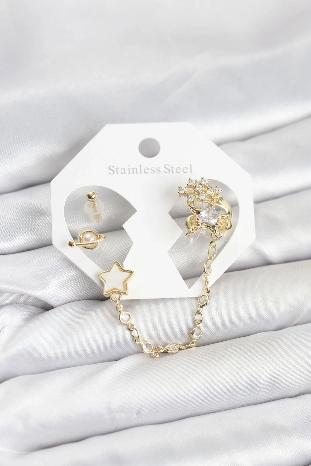 Erb Pirinç Gold Renk Yıldız Model Zincir Bağlantılı Ear Cuff Küpe Seti