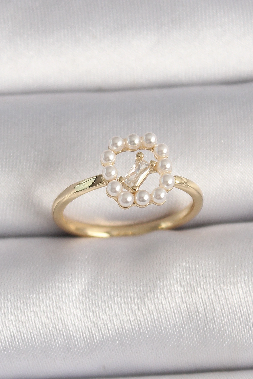 Erb Pirinç Gold Renk Zirkon Taş Detaylı İncili Ayarlanabilir Yüzük