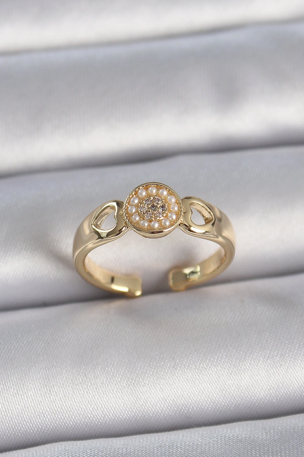 Erb Pirinç Gold Renk Zirkon Taşlı İncili Kalp İşleme Detay Ayarlanabilir Kadın Yüzük