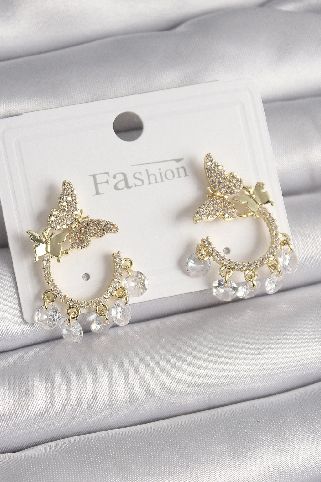 Erb Pirinç Gold Renk Zirkon Taşlı Sallantı Detay Kelebek Model Kadın Küpe