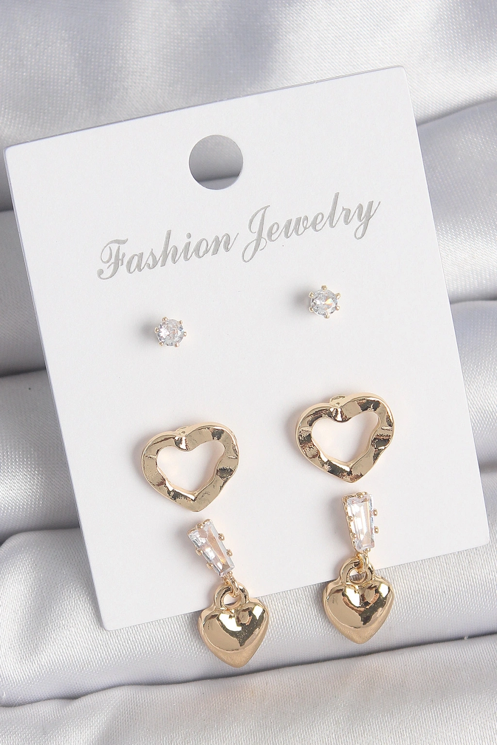 Erb Pirinç Gold Renk Zirkon Taşlı Sallantı Kalp Model Kadın 3 Çift Küpe Seti